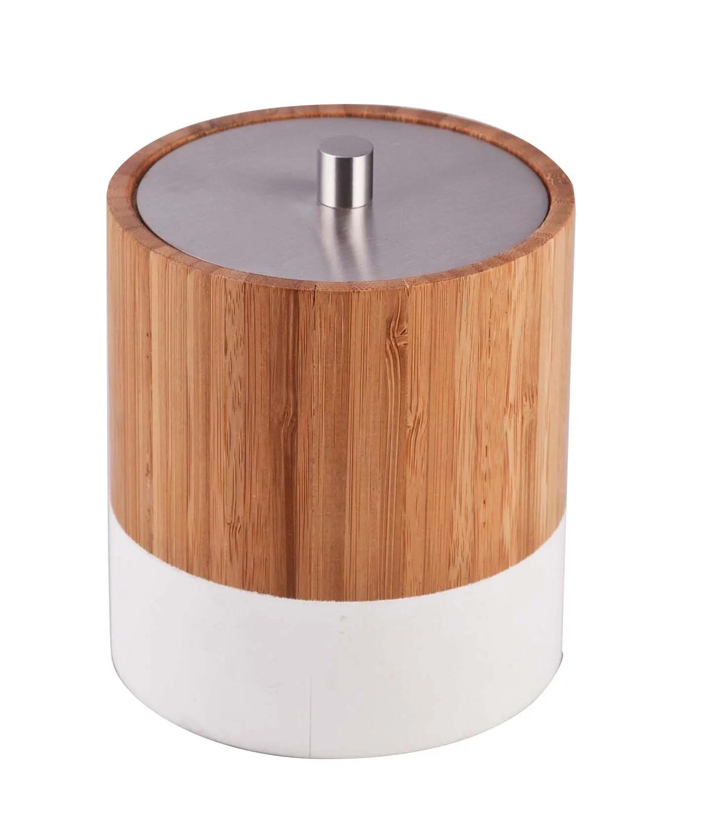 Boîte à coton en bambou blanche de forme cylindrique. Idéal pour ranger esthétiquement la salle de bain. Dimensions : 10x11 cm (largeur x hauteur).