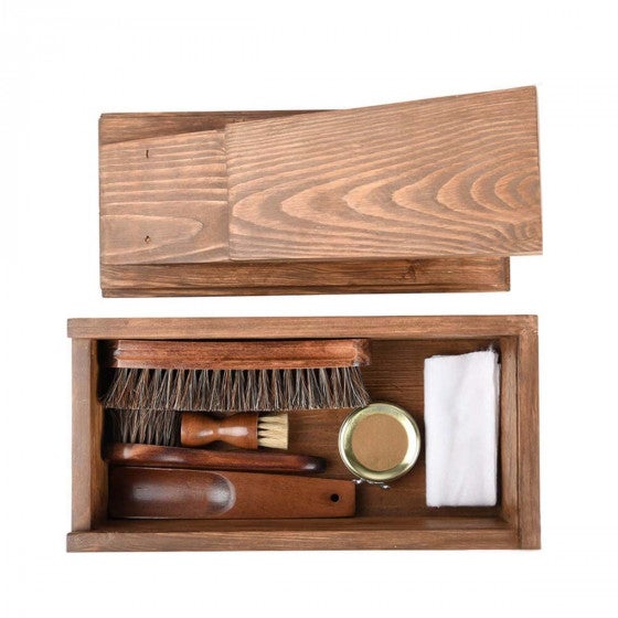 Tire bottes et boîte à cirage en bois. Boîte en pin coloré. Couvercle coulissant avec repose pied. Le kit d'entretien pour chaussures comprend : Une grande brosse : en crin de cheval, cette brosse permet d'enlever la saleté et de lustrer vos chaussures. Une brosse médium : en crin de cheval, cette brosse permet d'appliquer le cirage et de nettoyer vos chaussures. À utiliser avec un savon de nettoyage pour le cuir. Un badigeonneur rond : en poil de porc, ce badigeonneur permet de cirer vos chaussures. Un chausse-pied : pour mettre vos chaussures plus facilement. Une cire noire de polissage - boîte de 16g : cette cire permet d'entretenir, de nourrir et de faire briller toutes les chaussures noires en cuir. Un chiffon de nettoyage - 19cm x 19cm : en coton blanc, ce chiffon apportera une finition impeccable à vos chaussures. Dimensions de la boîte en bois : Hauteur : 9 cm / 17cm avec le tire - bottes Longueur : 29,5 cm Largeur : 14 cm Poids : 1,406 kg