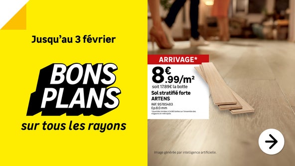 Offre valable du 7 janvier au 3 février 2026 inclus, sur le site leroymerlin.fr et dans les magasins participants, sur une sélection de produits. Offre valable dans la limite des stocks disponibles.