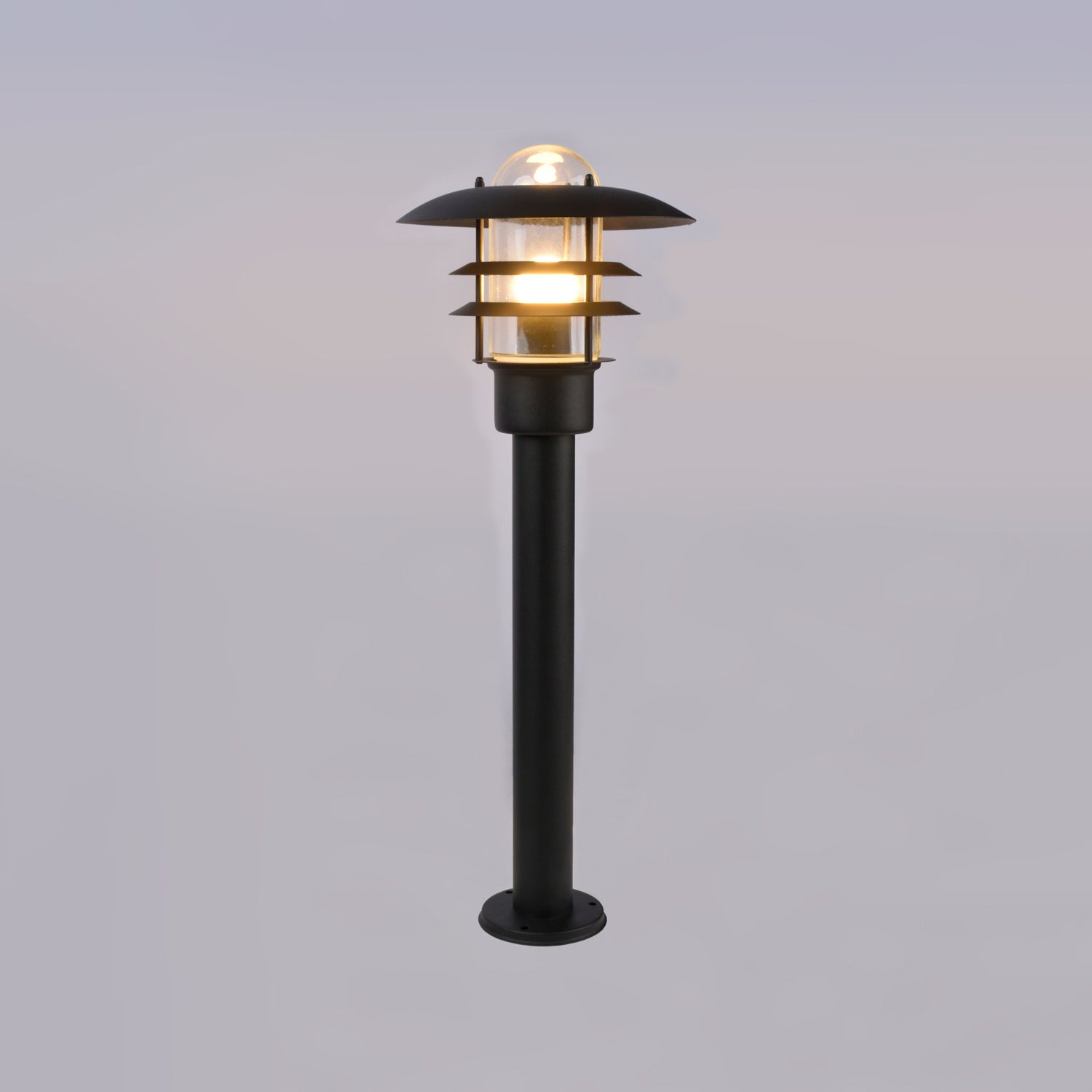 Borne en acier inoxydable. Diffuseur en verre transparent. Coloris : noir. D24cm - H65cm. IP44. Classe 1. E27-60W.