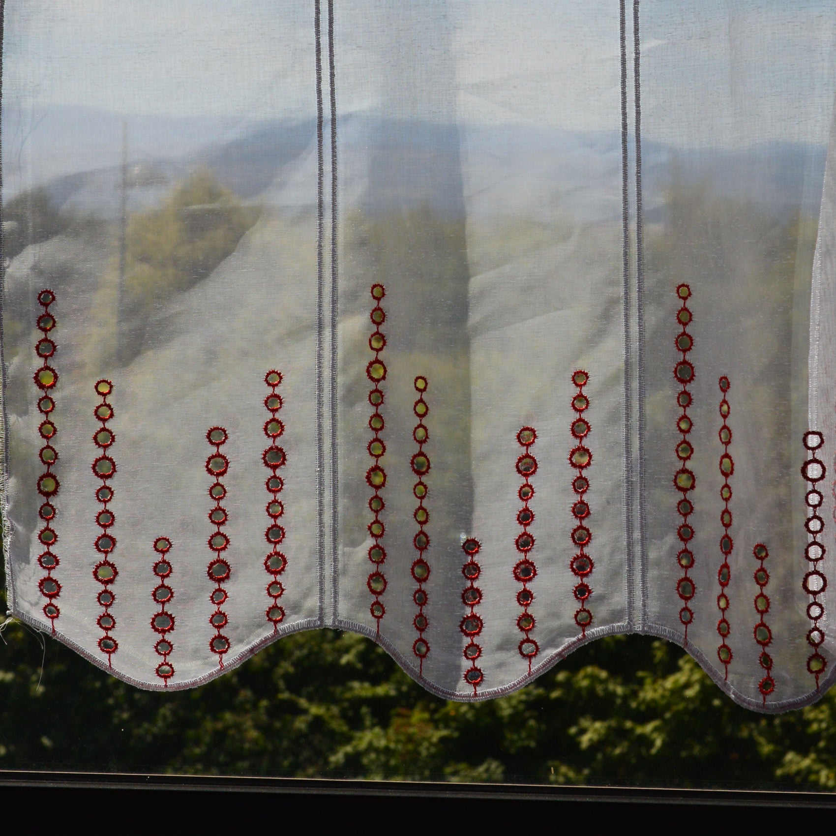 Découvrez notre charmant brise-bise au bas festonné et orné de motifs géométriques ronds verticaux et colorés.