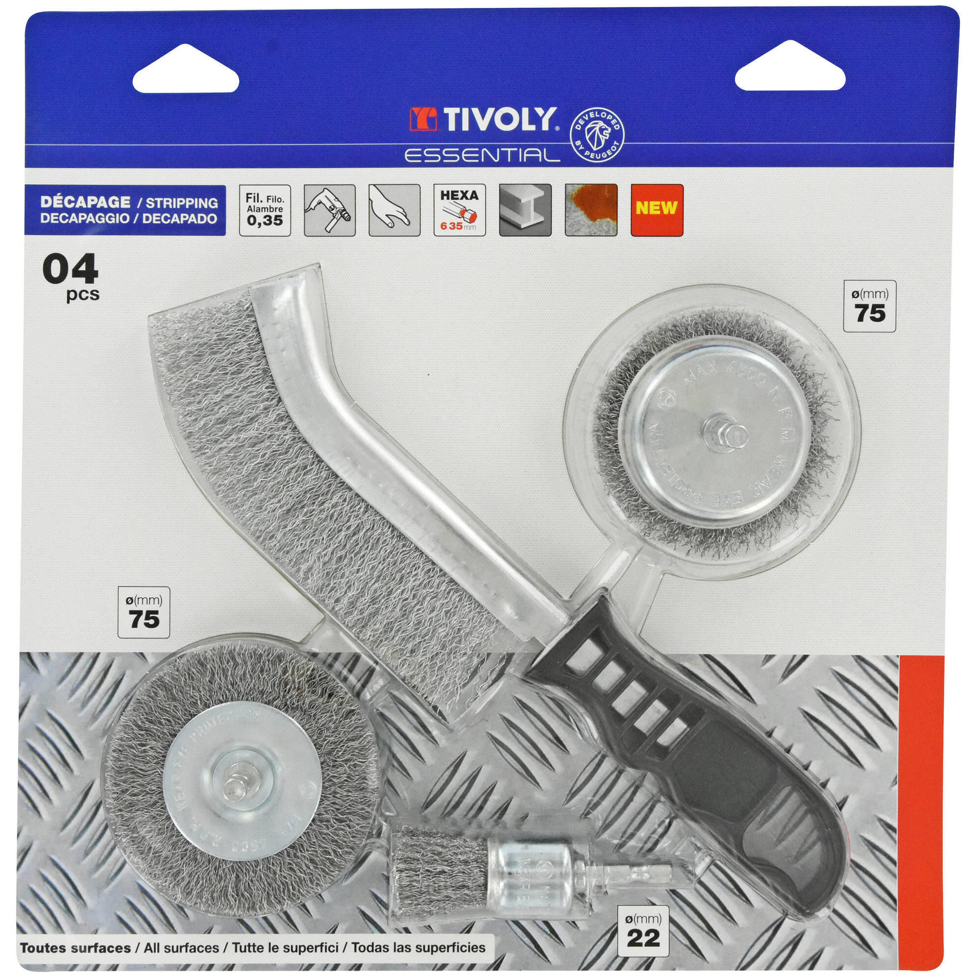 Lot de 4 brosses fil acier ondulé : 1 brosse circulaire Ø 75mm + 1 brosse coupe Ø 75mm + 1 brosse pinceau Ø 22mm + 1 brosse main ergonomique