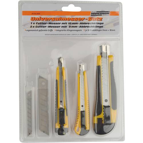 Kit de mesure universel Données techniques : Poids : 0.260 kg Contenu de livraison : 2 couteaux universels 9 mm, 1x couteau universel 18 mm, 10 lames de rechange (9 mm + 18 mm) Ce texte a été traduit par une machine.