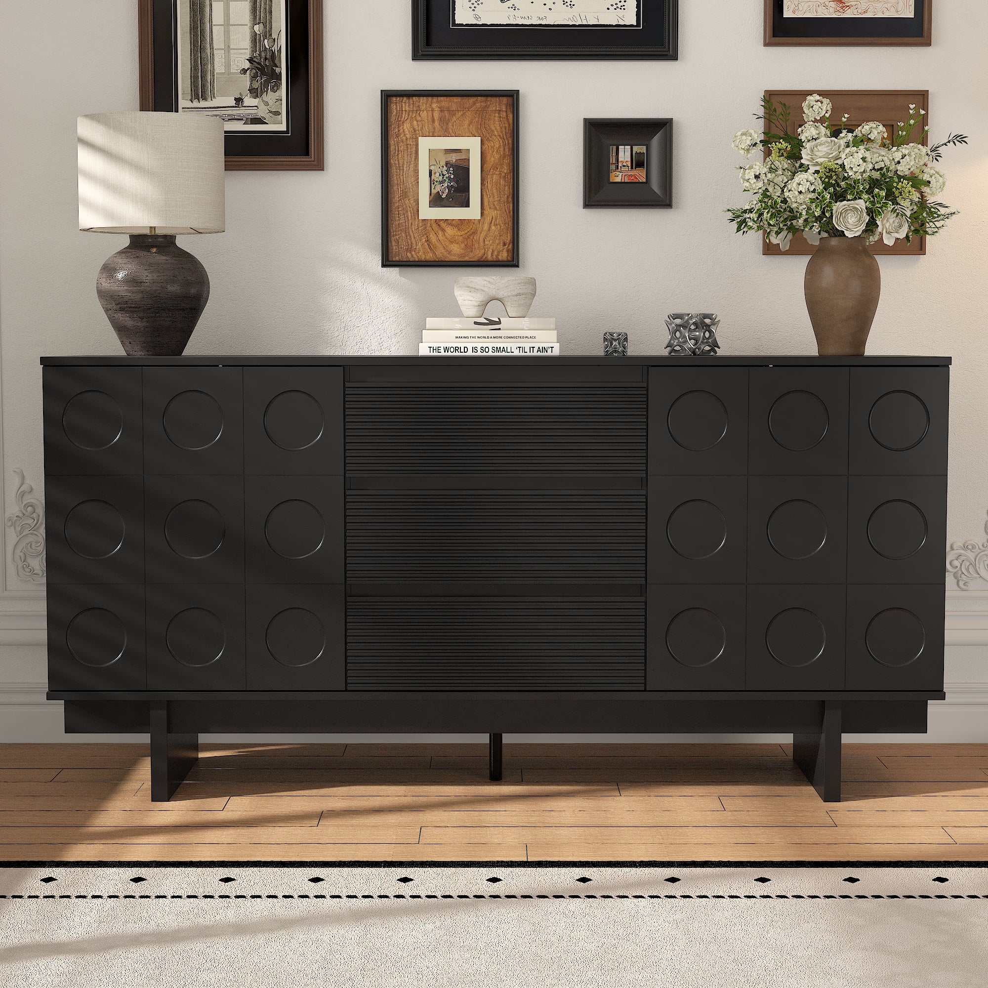 La finition noire mate, les poignées et les pieds argentés créent une touche d’élégance contemporaine. L’absence de veinage du bois, les lignes épurées et couleur unie pour s’intégrer facilement à tous les styles de décoration. Les portes et tiroirs avec moulage en forme de cercles créent un design unique et distinctif.