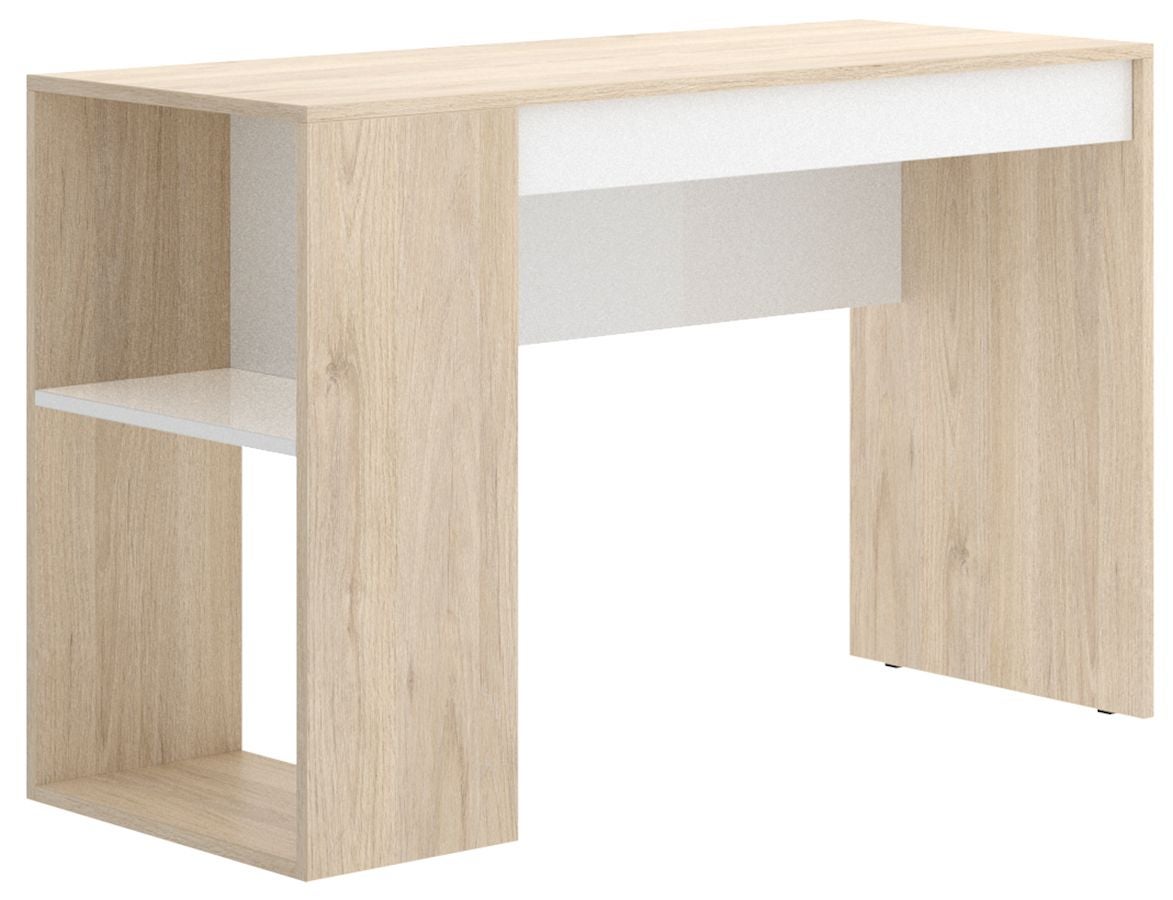 Bureau un tiroir et une étagére de rangement en panneaux de particules mélaminés, dim. 115x74x50cm finition structure en chene naturel façade tiroir blanche. La finition mélaminée est l'assurance d'un produit facile a entretenir et d'une meilleure résistance a l'humidité, aux rayures et aux chocs.