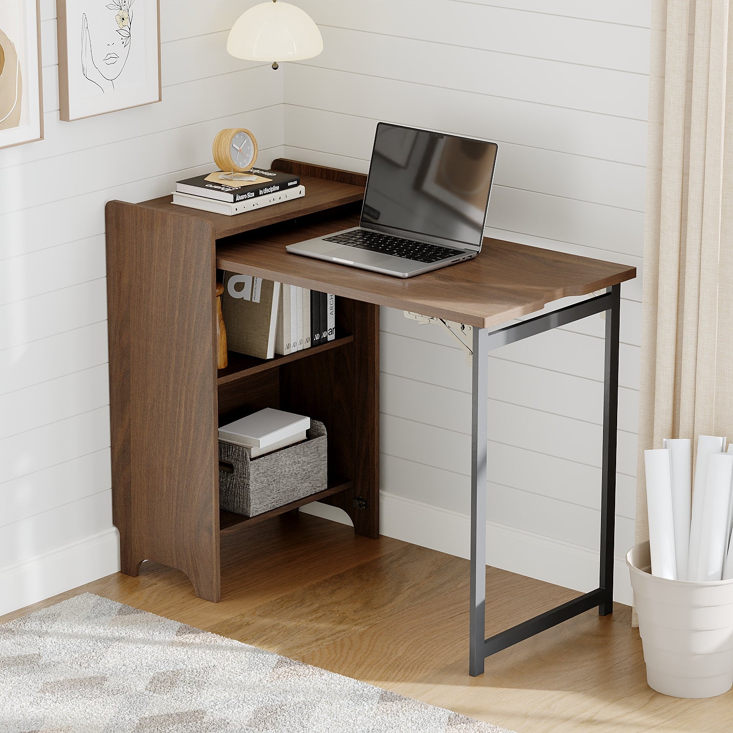 La structure renforcée avec tubes métalliques peints en noir, résistants à la rouille et à la corrosion. Charge supportée : ≥8 kg par tube et ≥30 kg pour le bureau déplié (ordinateur portable, lampe, livres...). Stabilité garantie sans vibration. Ce bureau de rangement est fabriqué en panneau de mélamine couleur noyer sur support MDF. Ce finition offre un aspect bois de noyer réaliste, associé à une grande résistance aux rayures, à l’usure et une facilité de nettoyage.