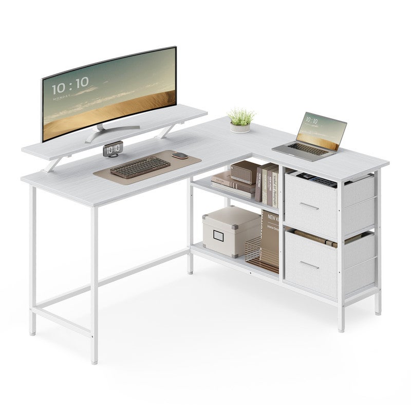 Bureau d'Ordinateur en Forme de L, Bureau d'Angle, 2 Tiroirs Spacieux, Support de Moniteur, Étagère Réglable, Blanc Érable