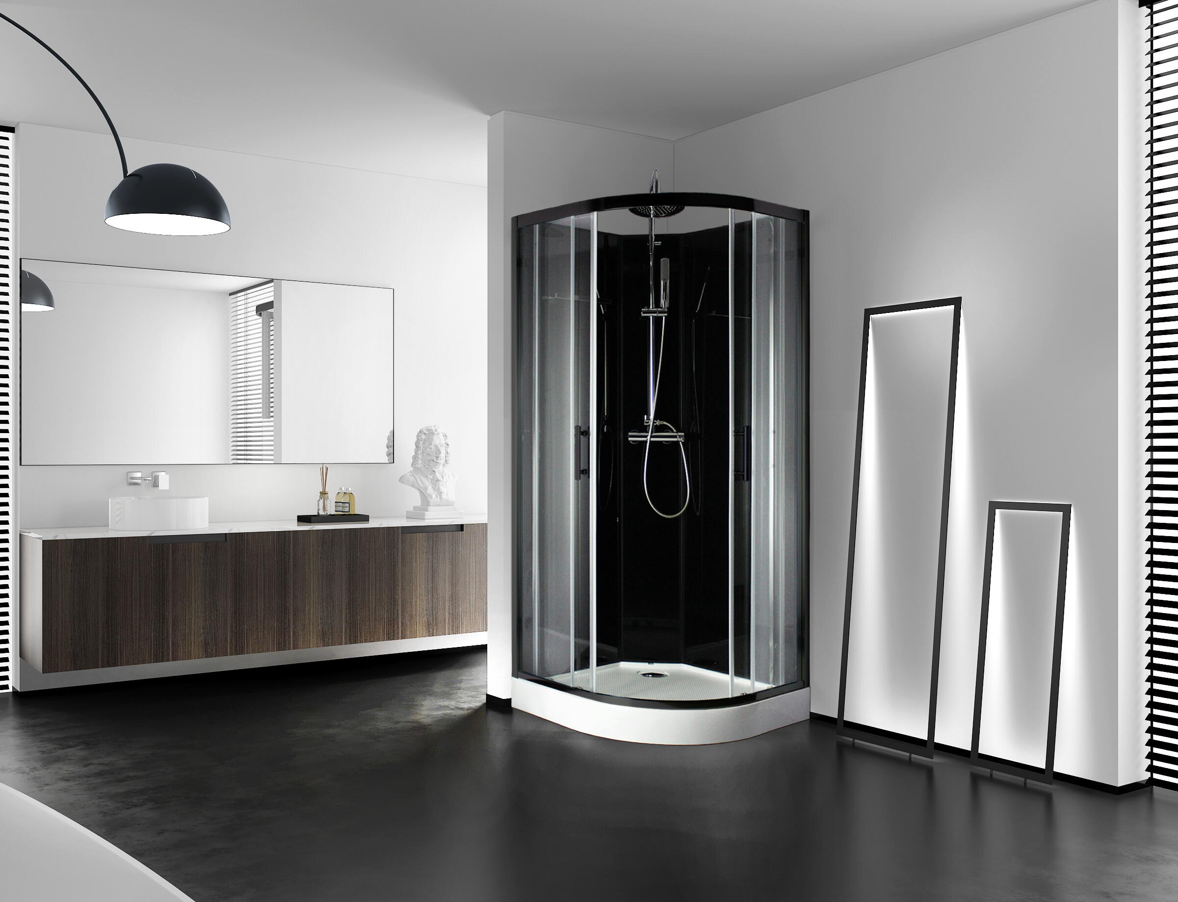Cabine de douche ¼ de cercle, 90x90cm, noire, verre transparent 5mm, LYS