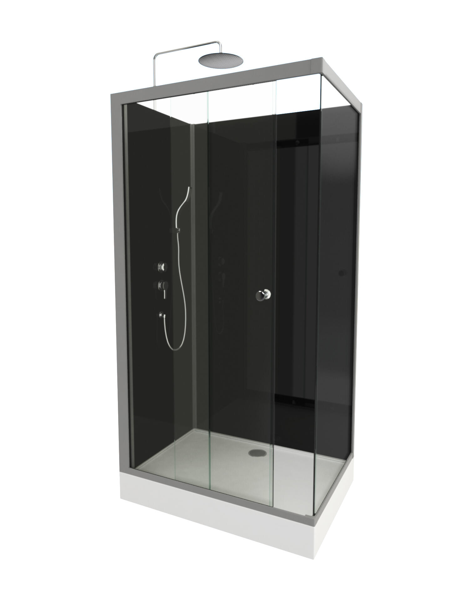 Cabine de douche mod. Éclipse. Structure en aluminium laqué gris argent. Dimensions : 80x110x230cm. Portes coulissantes en verre de sécurité trempé de 5 mm. Fond en verre noir de 4 mm. Receveur de douche 1/4 de cercle en acrylique renforcé blanc. Robinet à levier unique chromé. Pomme de douche chromée anticalcaire effet pluie réglable en hauteur. Douchette à main becs anticalcaire chromés buses anticalcaire. PVC flexible. Bonde grand format 90 mm. Pose réversible. Système de montage sans silicone. Montage rapide sans vis. Nettoyage facile. Également disponible dans les dimensions de 80x80x230cm