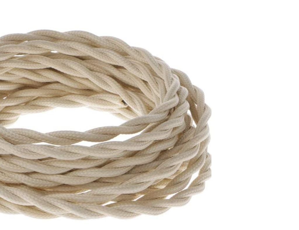 Câble électrique tressé en soie beige de haute qualité, idéal pour créer des lampes rétro-vintage originales, uniques et personnalisées. Section du câble : 2 x 0,75 mm². Le prix indiqué est au mètre.
