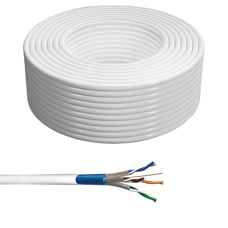 Bobine de câble Ethernet RJ45 CAT6 multibrin S/FTP CCA AWG26 - 100m BlancConducteur en aluminium plaqué cuivre (CCA), AWG 26/7 (stranded), gaine de câble en polyéthylène (PE) Le câble réseau de Connecticplus est idéal pour une pose en extérieur. Exemples le jardin ,camping, ou façades de bâtiments et pour le raccordement de caméras de surveillance. La gaine de câble en polyéthylène à double protection est extrêmement résistante aux intempéries et aux rayons UV.SpécificationCat 6Diamètre du conducteur isolé 1 mm (+/-0.05)Type de câble câble extérieurLongueur de câble 100m BlancMatériau conducteur interne CCA (aluminium revêtu de cuivre)AWG 24/7 (multibrins)Diamètre de la gaine de câble (sur) 6.3 mmClasse de blindage S/FTPClasse de feu (CPR) FcaGaine de câble Matériau PETransmission du signal utilisable jusqu'à la longueur de câble 20mImpédance 100 ? max.Bande passante 250 MHz