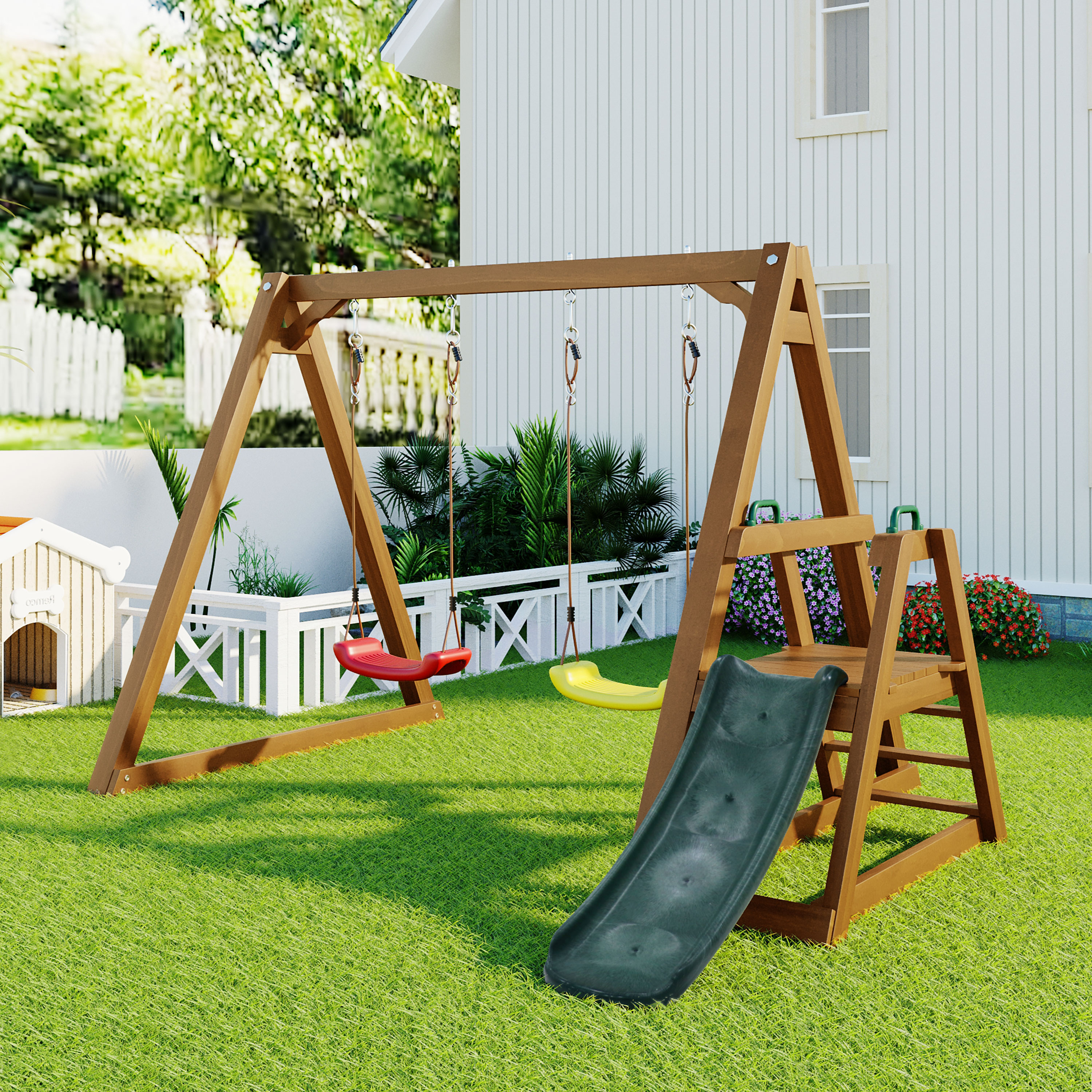 Cadre de 2 balançoires 238,5x240x168,9 cm pour enfants 3+ avec toboggan et échelle de grimpe, en bois, couleur chêne, pesant 45 kg et avec une charge maximale supportée de 50 kg. Ce produit sera livré en 2 colis sur plusieurs jours en France métropolitaine (hors Corse et DOM-TOM) avec livraison standard au pied de l'habitation, bénéficie d'une garantie de 2 ans. Les colis peuvent arriver séparément. Différences de couleur possibles en raison du rayonnement solaire et autres facteurs.