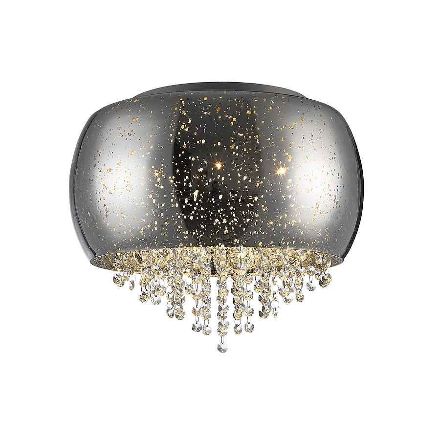 Modèle de panneau de plafond CAELUM CROMO, fait de métal fini chromé avec tulipe en verre soufflé argenté miroir et décoration d'effet étoilé. Intérieur avec des bandes de verre à facettes. Taille 40 cm de diamètre et 31,5 cm de haut. Éclairage pour 5 ampoules de type G9 de 6 w, incluses. La collection CAELUM nous propose les formats plafon en deux tailles, lampe pendentif en deux tailles et lampe murale, pour compléter tous les points d'une même pièce avec le même style lumineux.