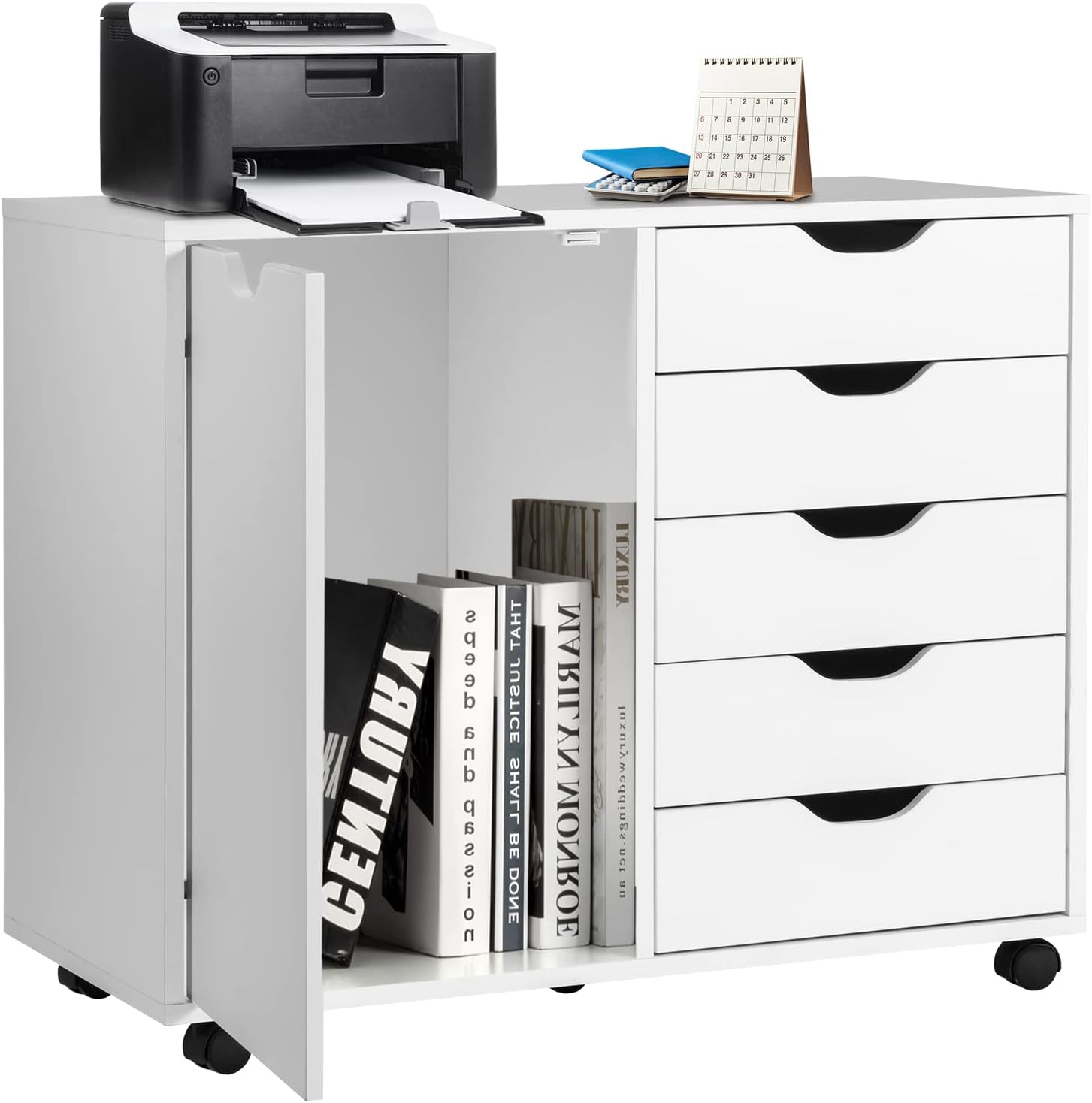 - 【Grand espace de rangement:】Le caisson de rangement à 5 tiroirs range mieux les stylos, agrafeuses, calculatrices et autres fournitures. Le grand plateau contient l’imprimante ou la scanner. Un grand placard à porte range des livres et des dossiers.