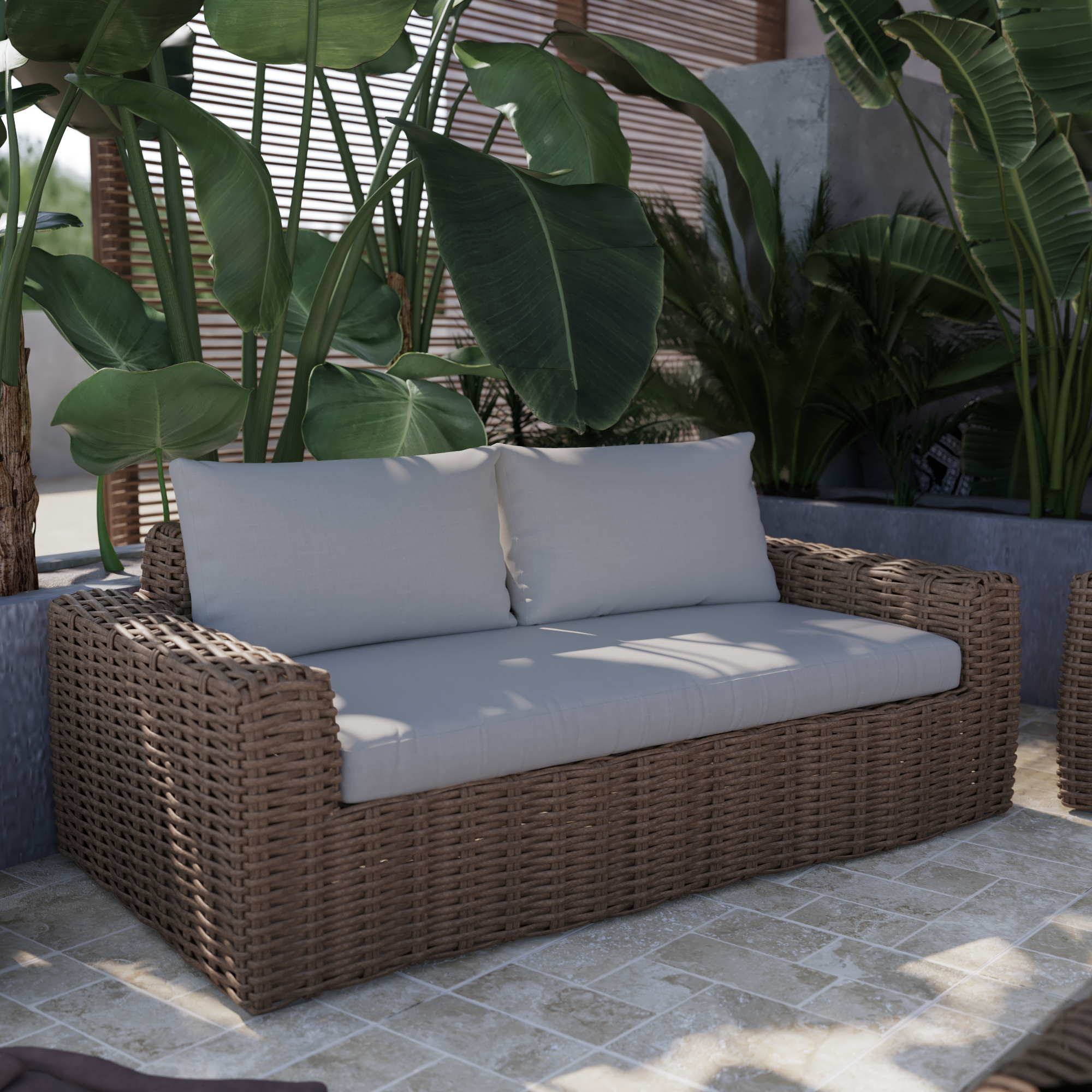 Adoptez le style tropical du salon de jardin Ayamo Une pause café dans un décor dépaysant Conçu pour accueillir 2 personnes, le sofa 2 places Ayamo est composé d'un tressage en rotin synthétique aux tons naturels, et sa structure en aluminium lui procure résistance à l'humidité et robustesse. Installez-vous confortablement dans ses coussins larges, déhoussables et déperlants pour passer de bons moments saison après saison. Un style tropical et coordonable La gamme Ayamo se distingue par son osier synthétique foncé d'inspiration bohème, et ses coussins écrus qui donneront à votre extérieur un air estival. Composez votre espace détente avec les divers élements de salon de jardin de la gamme pour l'adapter à la taille de votre extérieur et aux nombre de convives. Des matériaux faciles d'entretien Pratique au quotidien, l'osier synthétique du sofa est résistant aux intempéries, et nécessite peu d'entretien par rapport à l'osier naturel. Un chiffon humide et un savon neutre suffisent à son entretien.
