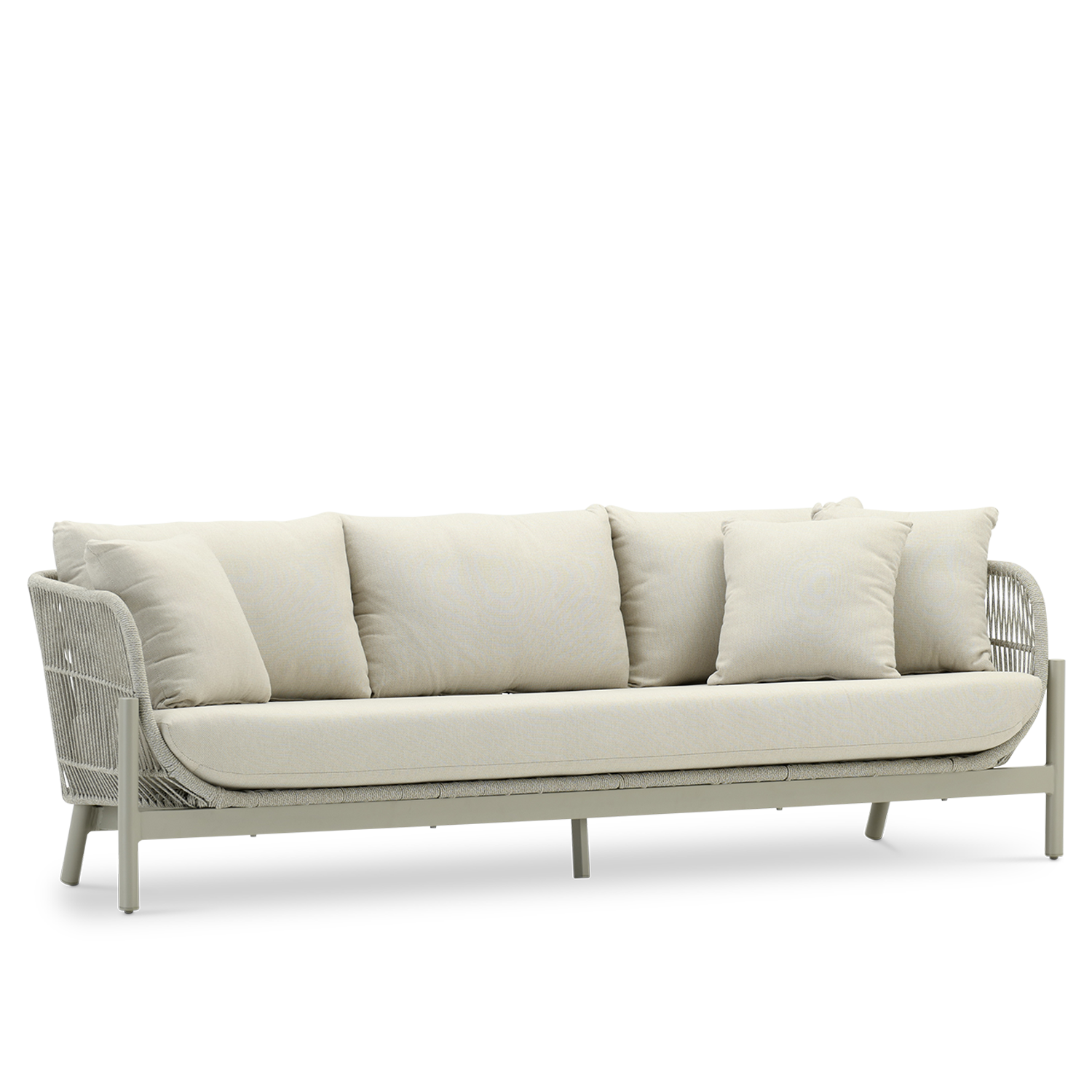 La collection Milos se distingue par la simplicité de ses formes et de ses lignes courbes. Dans des tons neutres et élégants, la combinaison des matériaux, tissu, aluminium et corde, s'harmonise dans tous les espaces. Canapé 3 places en aluminium beige Corde beige tressée à la main Coussins déhoussables beige Dimensions : 231x78x68cm.