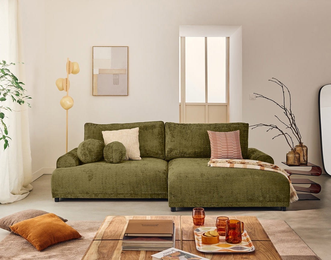 Canapé d'angle droit convertible 4 places en velours texturé vert olive - NELLY - Best Mobilier