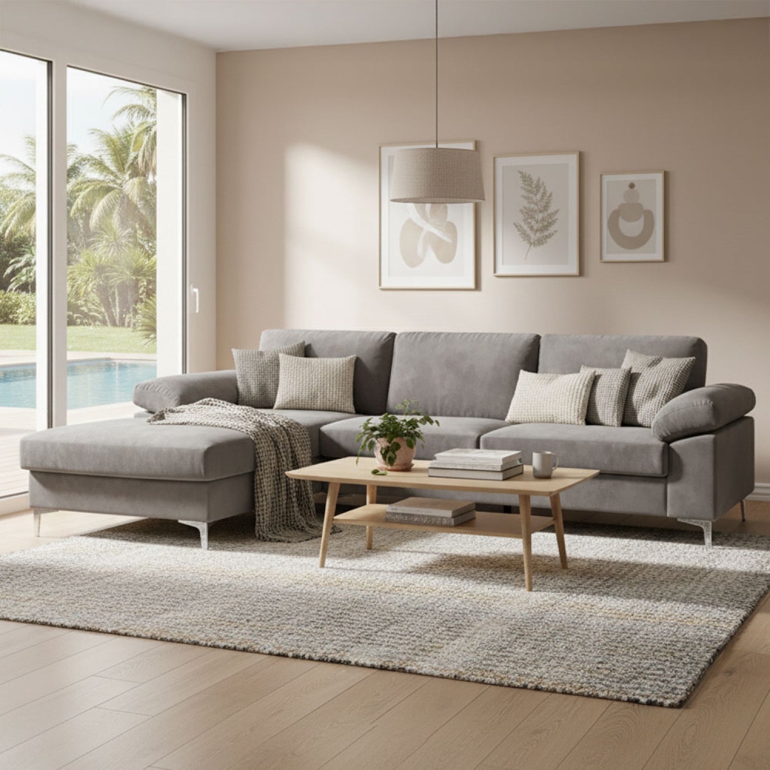 Canapé d'angle 4/5 places GALWAY velours gris Découvrez notre canapé d'angle en velours gris Galway. Sa grande largeur de 260 cm lui permet d'accueillir jusqu'à cinq personnes. Avec ses grandes épaisseurs de coussins d'assise et de dossiers, vous serez sûr d'être confortablement installé pour passer de bons moments avec vos proches. Son revêtement en velours doux au toucher et son design élégant transformeront votre espace de vie en un havre de confort et de style. Caractéristiques techniques Nombre de places : 4/5 Couleur : gris Revêtement : tissu en velours Piètement : métal et plastique Structure : cadre en bois avec tissu Assise : polyester 0.9kg et suspensions ressorts zig zag Densité : 28 kg/m3 Poids maximum supporté : 250kg Convertible : non Angle modulable : non Angle sur le côté gauche Entretien Nettoyage facile à l’aide d’un chiffon humide Dimensions Dimension totale : 262 x 132 x 77 cm Poids total : 63.5 kg Hauteur pied : 13 cm Hauteur assise : 48 cm Profondeur assise : 49 cm Epaisseur de l’assise : 35 cm Hauteur du dossier : 40 cm Epaisseur du dossier : 33 cm Dimensions de l’accoudoir : 61 x 23 cm Conditionnement Le produit est conditionné dans 2 colis de : 1735 x 765 x 365 mm / 38 kg 935 x 1335 x 365 mm / 35 kg Montage facile une notice est fournie. * Garantie 2 ans