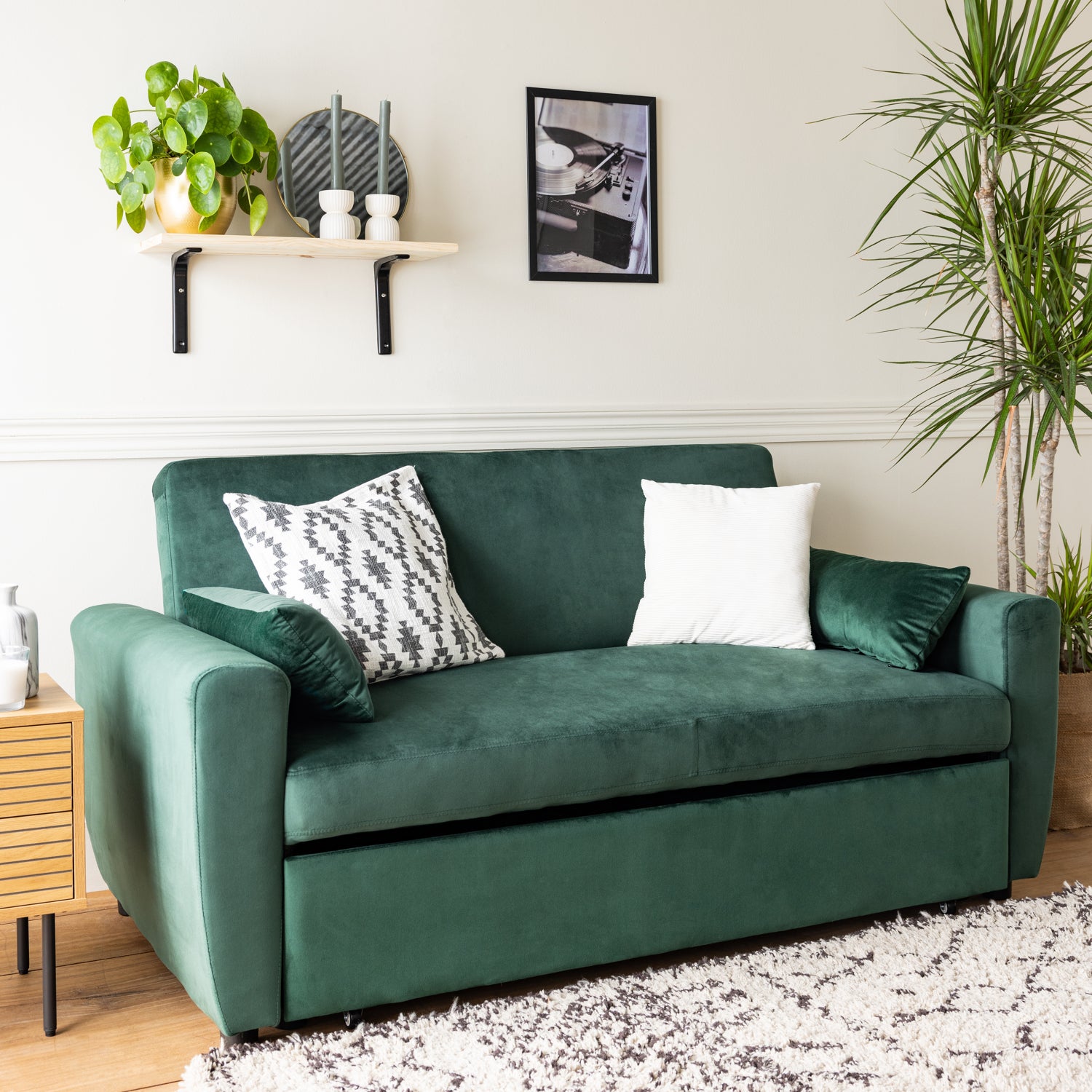 Vous n'aurez plus à vous soucier de recevoir des invités pour la nuit grâce à ce canapé convertible qui passe du sofa au lit de manière simple et rapide. Tirez simplement la poignée située sous l'assise et déployez le lit sans effort, dès que vous en avez besoin. Le modèle MATT a été fabriqué à partir de matériaux de qualité, avec du bois de bouleau et d'eucalyptus pour sa structure. Un revêtement en velours complète son look qui s'accordera facilement avec votre style de décoration d'intérieur, quel qu'il soit. Ce canapé-lit 2 places est doté d'accoudoirs, d'un haut dossier et de deux coussins qui maximisent votre confort durant les moments de détente à la maison. Choisissez-le pour aménager votre salon.