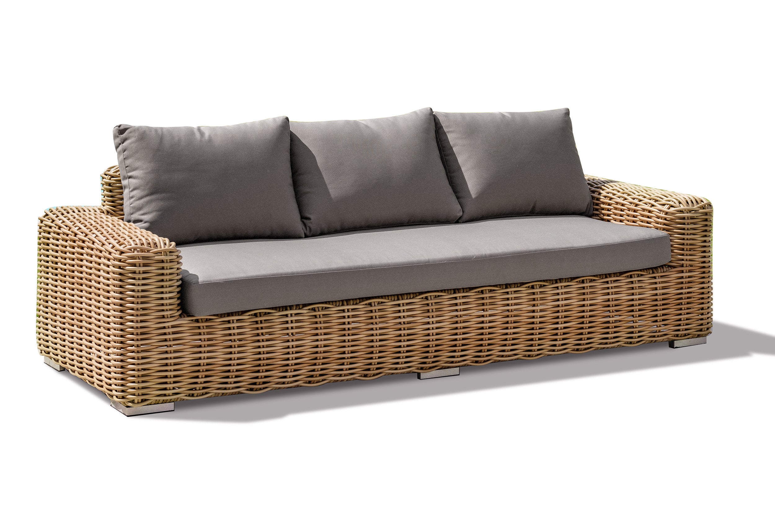 Canapé 3 places pour salon de jardin BORABORA en résine tressée ronde. Coussins déhoussables en toile 100% polyester taupe. DIMENSIONS L 220 x l 85 x H 64 cm Hauteur d'assise : 39 cm