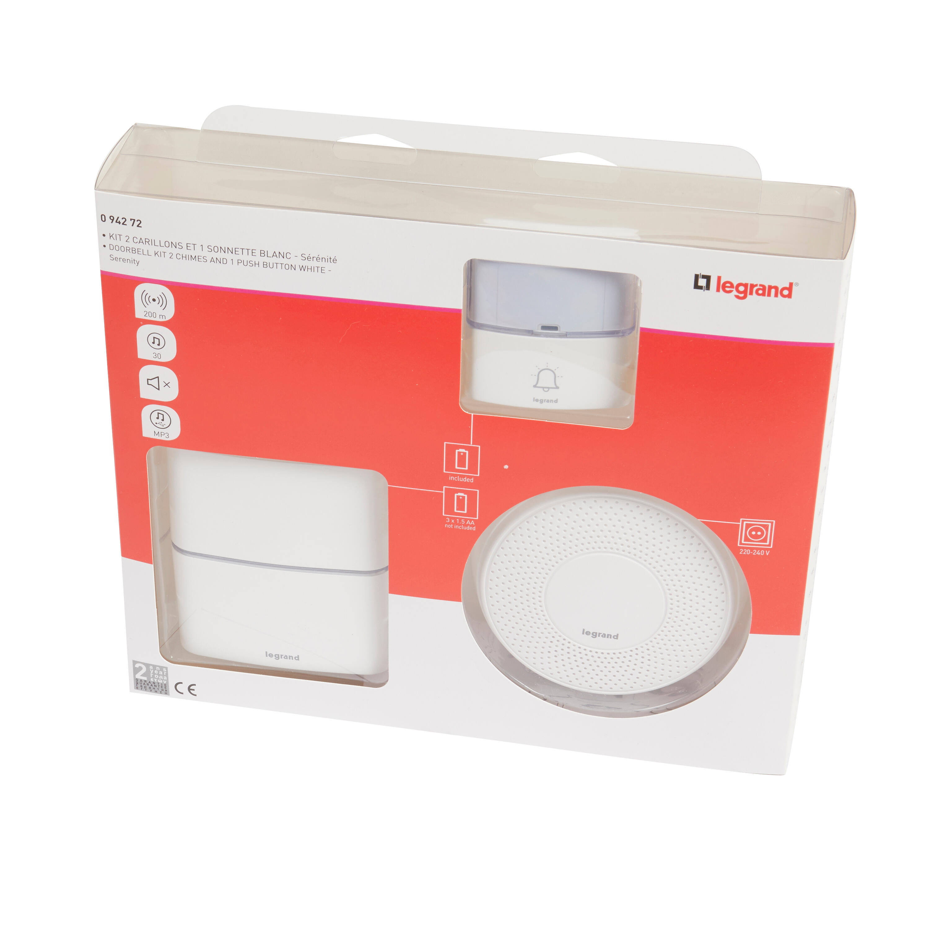 Design élégant pour ce kit radio Blanc adapté aux grandes maisons, composé d'une sonnette et 2 carillons: un à brancher sur prise 230V et l'autre sur piles avec une portée radio 200m, un flash lumineux et une mélodie personnalisable mp3.