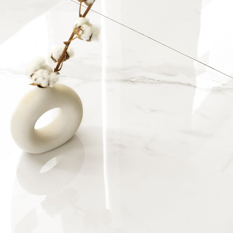 Carreau de porcelaine imitant le marbre, provenant spécifiquement de la région italienne de Carrare, d'où est extrait ce célèbre marbre. D'un format de 100x100 centimètres, il est d'un blanc pur avec des veines grises subtiles et raffinées. Sa finition polie offre une surface lisse et réfléchissante qui donne de la luminosité et de l'amplitude aux espaces. Grâce à ses conditions techniques, ce produit peut être installé dans n'importe quelle pièce, à l'intérieur comme à l'extérieur, bien que sa surface puisse être glissante au contact de l'eau. Le produit a été rectifié, ce qui signifie que ses bords ont été coupés avec précision pour obtenir des lignes droites et uniformes. Cela facilite la pose du carreau et permet une installation plus précise et mieux alignée. Le résultat est un aspect plus poli et plus moderne.