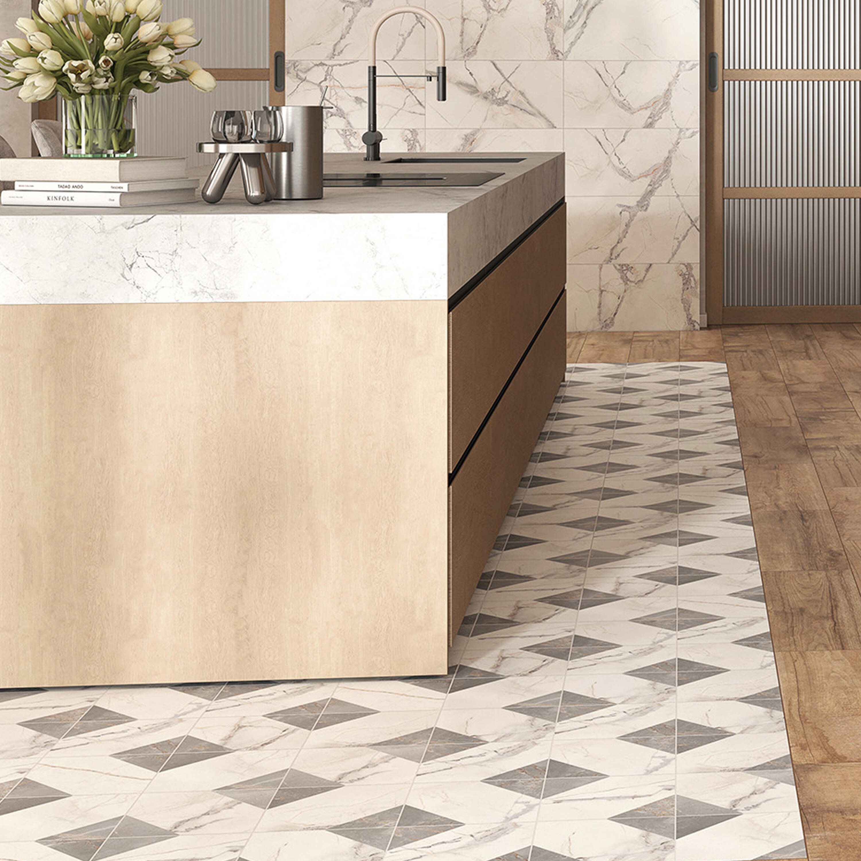 Grès cérame émaillé au format 20x20cm rectifié et en épaisseur 7,4mm, composé de 9 décorations différentes déjà mélangées à l'intérieur de la boîte, inspirés du marbre et déclinés dans des tons froids