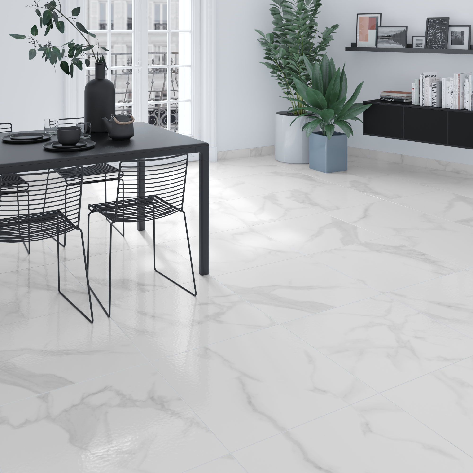 Reintérpretation céramique du matériel noble calacatta. Toucher suave et graphique rafinée