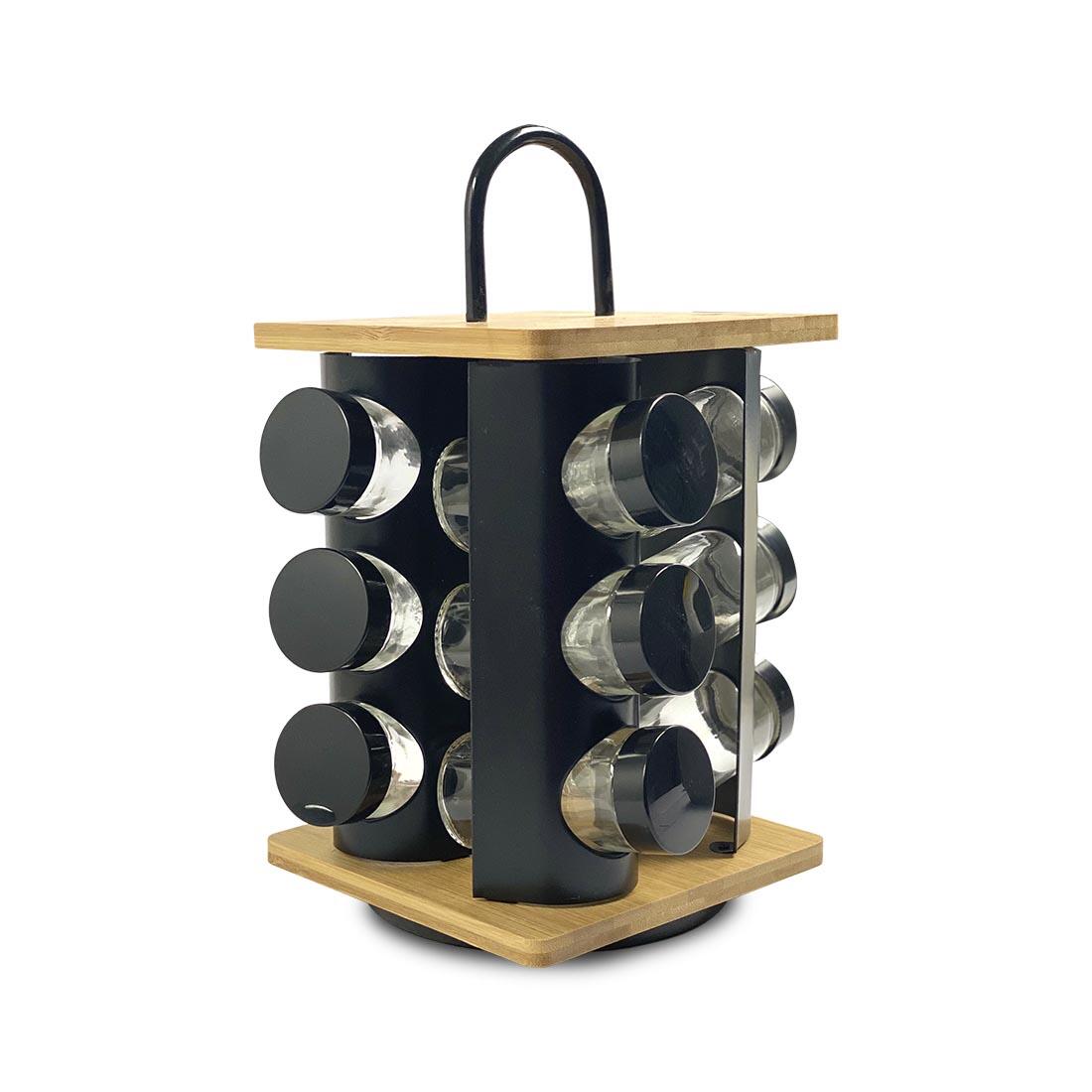 Carroussel metal noir, base et dessus bambou ,12 flacons en verre, couvercles en inox, dim. sans flacons : 16x16x30cm - dim. avec flacons : 18 x18 x 30 cm