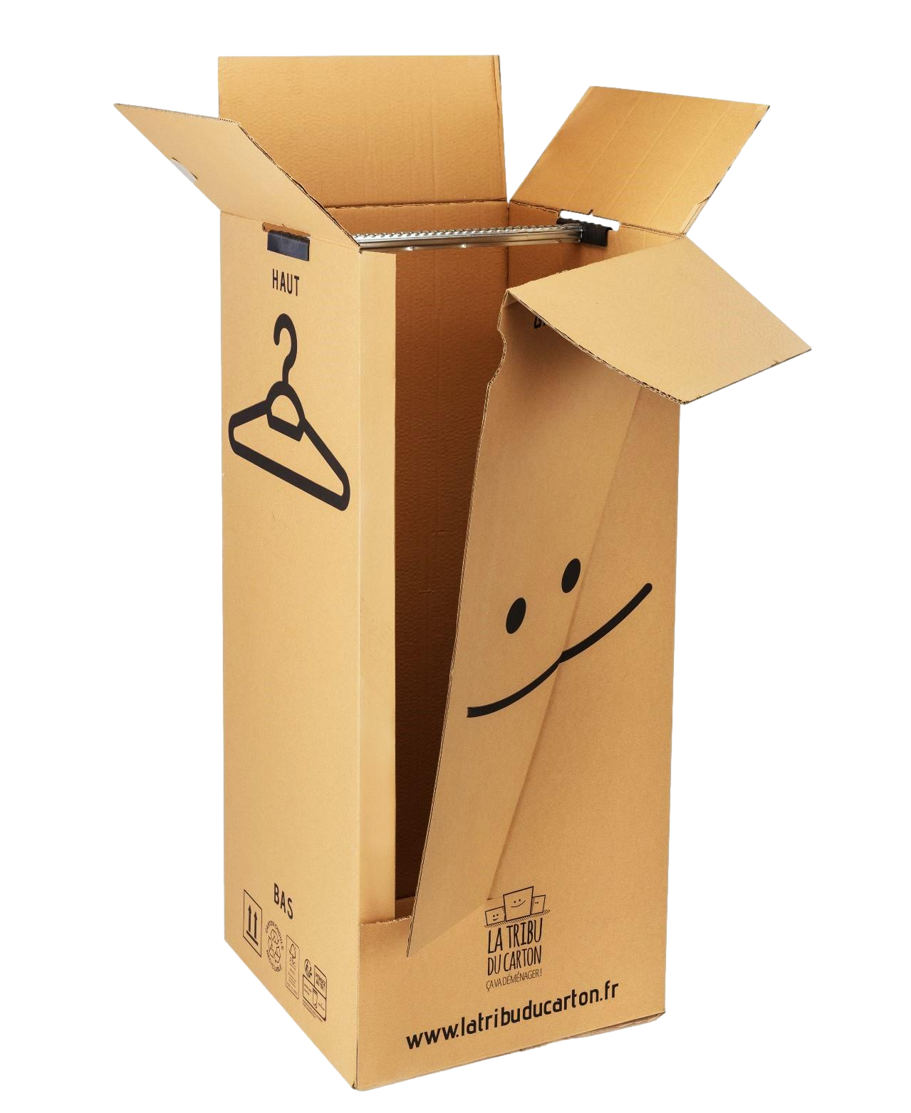 Voir sur le site "La tribu du carton " : 1) CARTON GRANDE PENDERIE AVEC POIGNÉES : L52 cm x l 50 cm x h 120 cm 2) CARTON PETITE PENDERIE AVION AVEC POIGNÉES : L 52 cm x l 50 cm x h 82 cm.