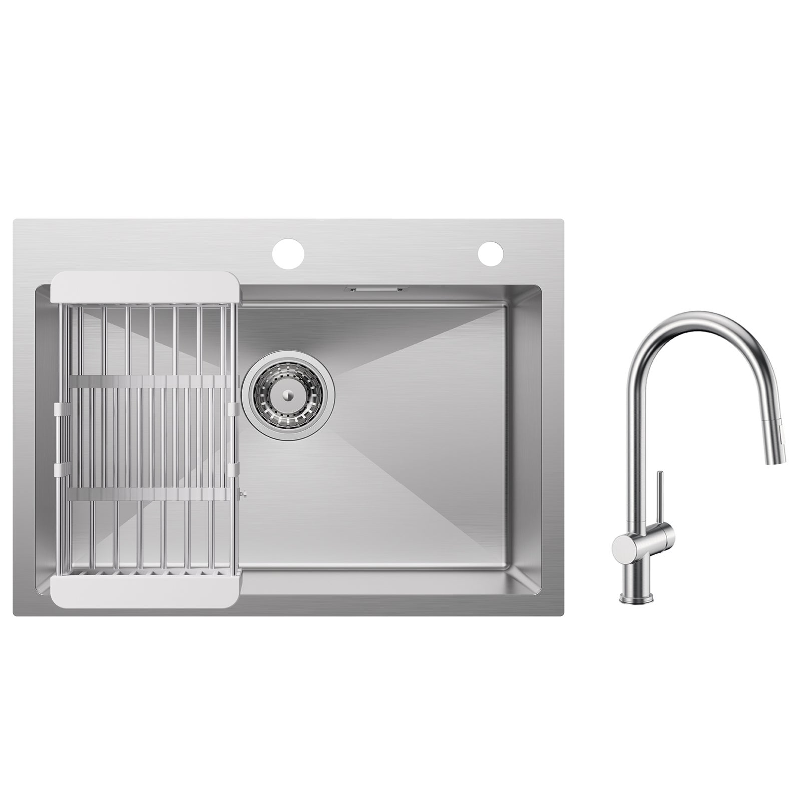 Cecipa max Évier Cuisine 1 Bac 60×45×18CM Évier Inox Brossé avec Panier de Drainage + Mitigeur de Cuisine avec Douchette Extractible Brossé