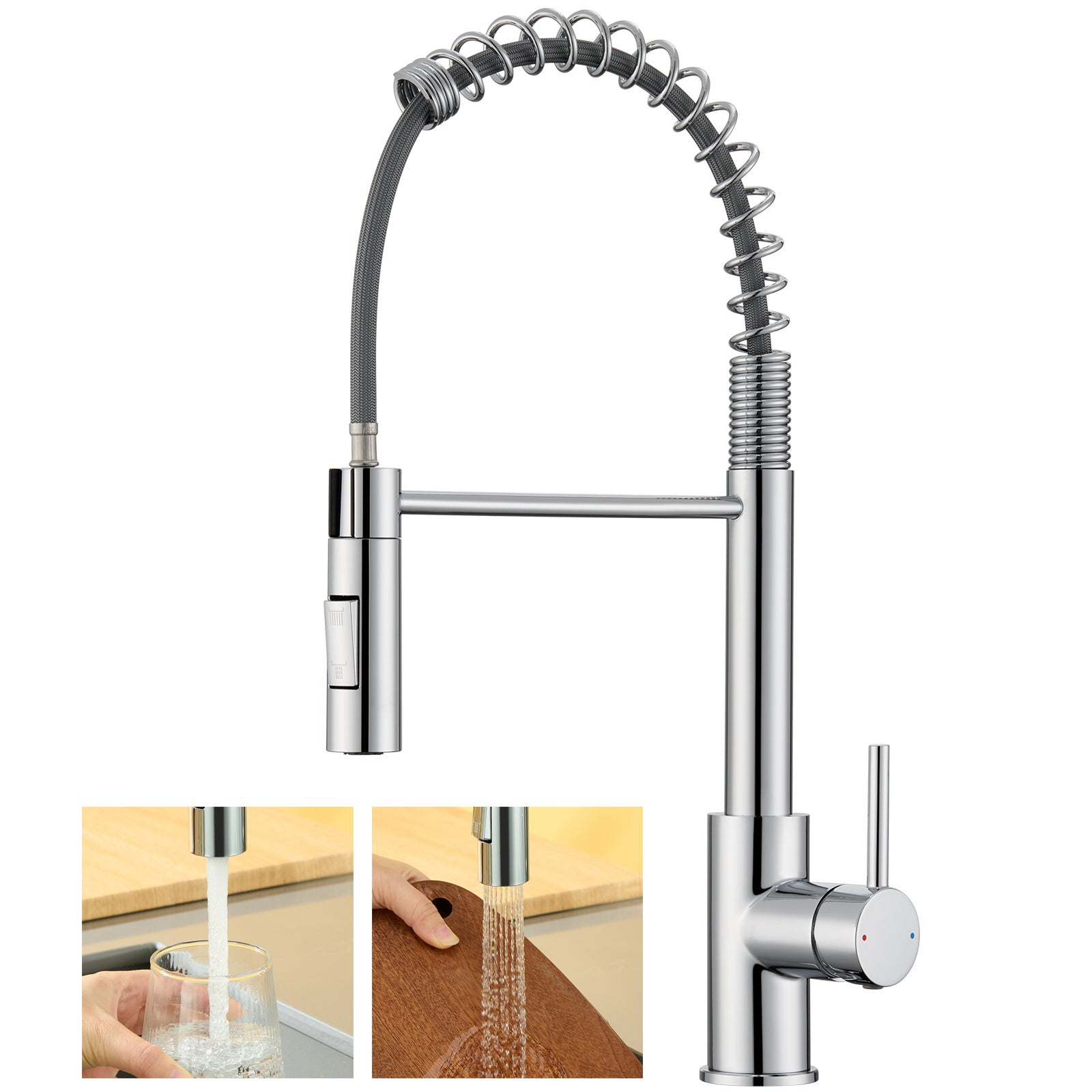 Ce robinet de cuisine est équipé d'un tuyau à ressort en acier inoxydable et d'un mécanisme de rotation à noyau inox, garantissant des années de fiabilité sans usure prématurée.