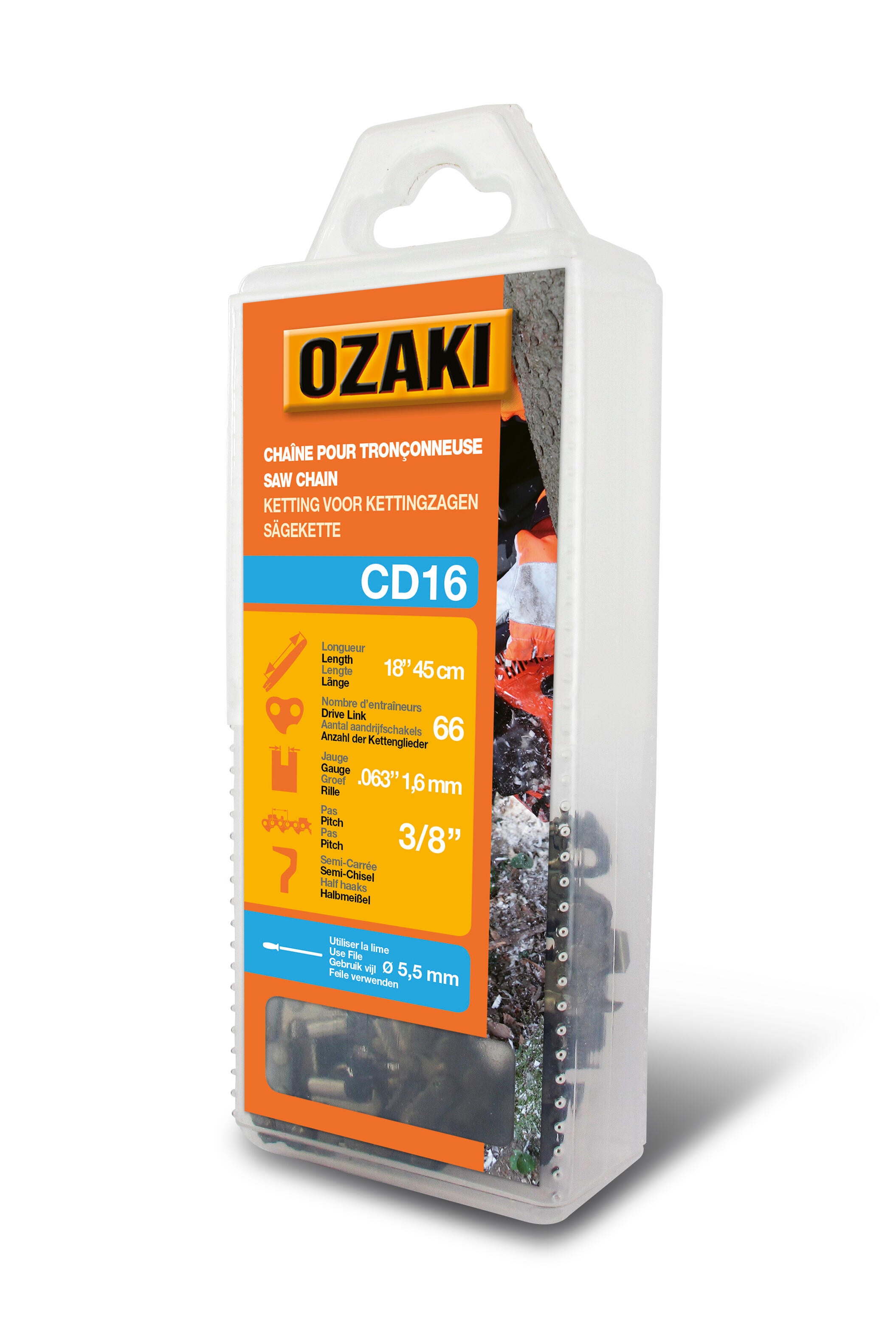 Chaîne de tronçonneuse OZAKI CD16 Pas de 3/8" Jauge 1,6mm 45cm 66 entraîneurs