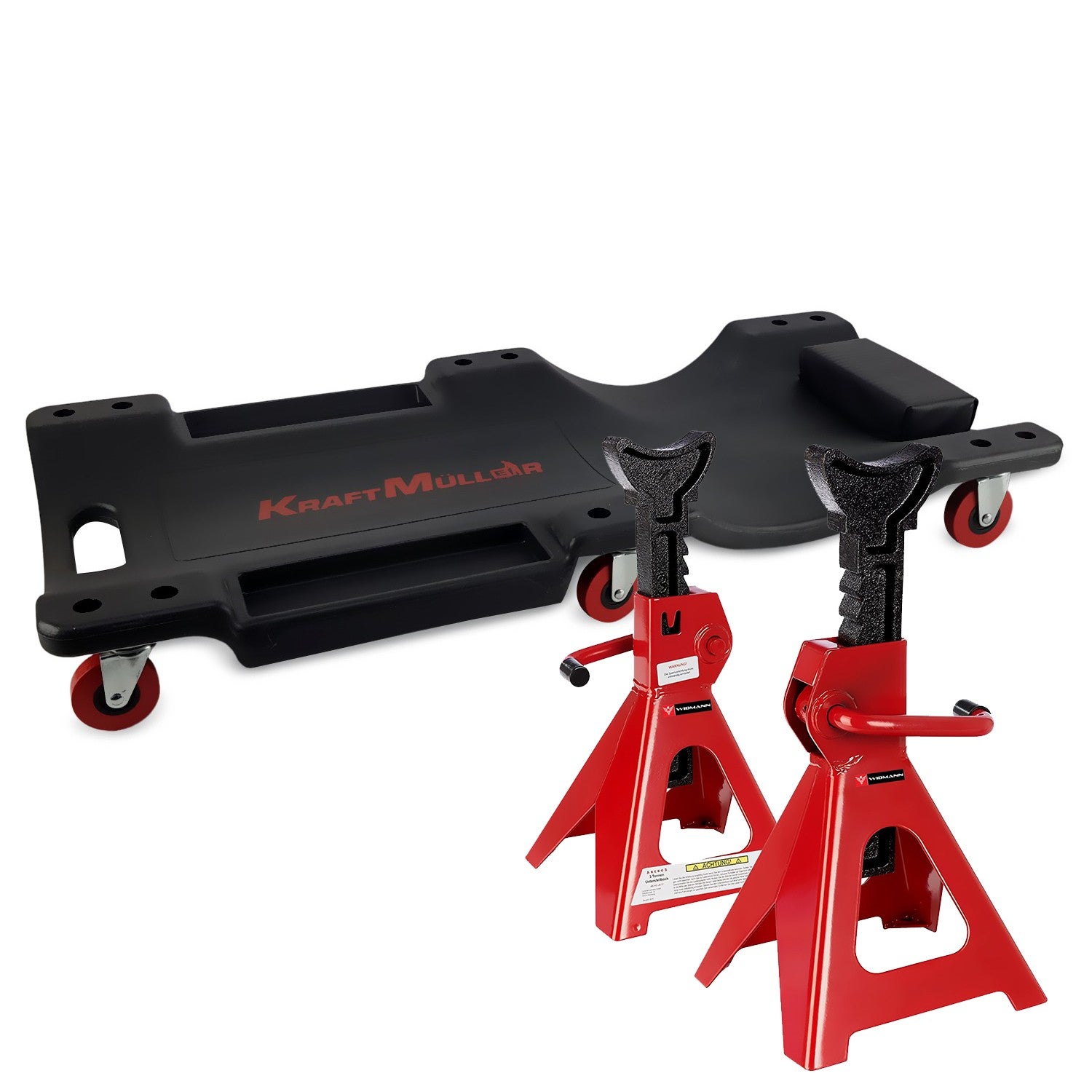 Pack mécanicien, garagiste, centre auto. N'importe où vous devez travailler en position couchée, sous un véhicule ou à la maison, le chariot de visite robuste de la marque KRAFT Müller vous aidera. Il ne pèse que 4 kg et un changement de direction ne pose pas de problèmes grâce aux roulettes à billes pivotantes. Paire de chandelles Widmann SJ3T à crémaillère 3 Tonnes, Levage Réglable en Hauteur