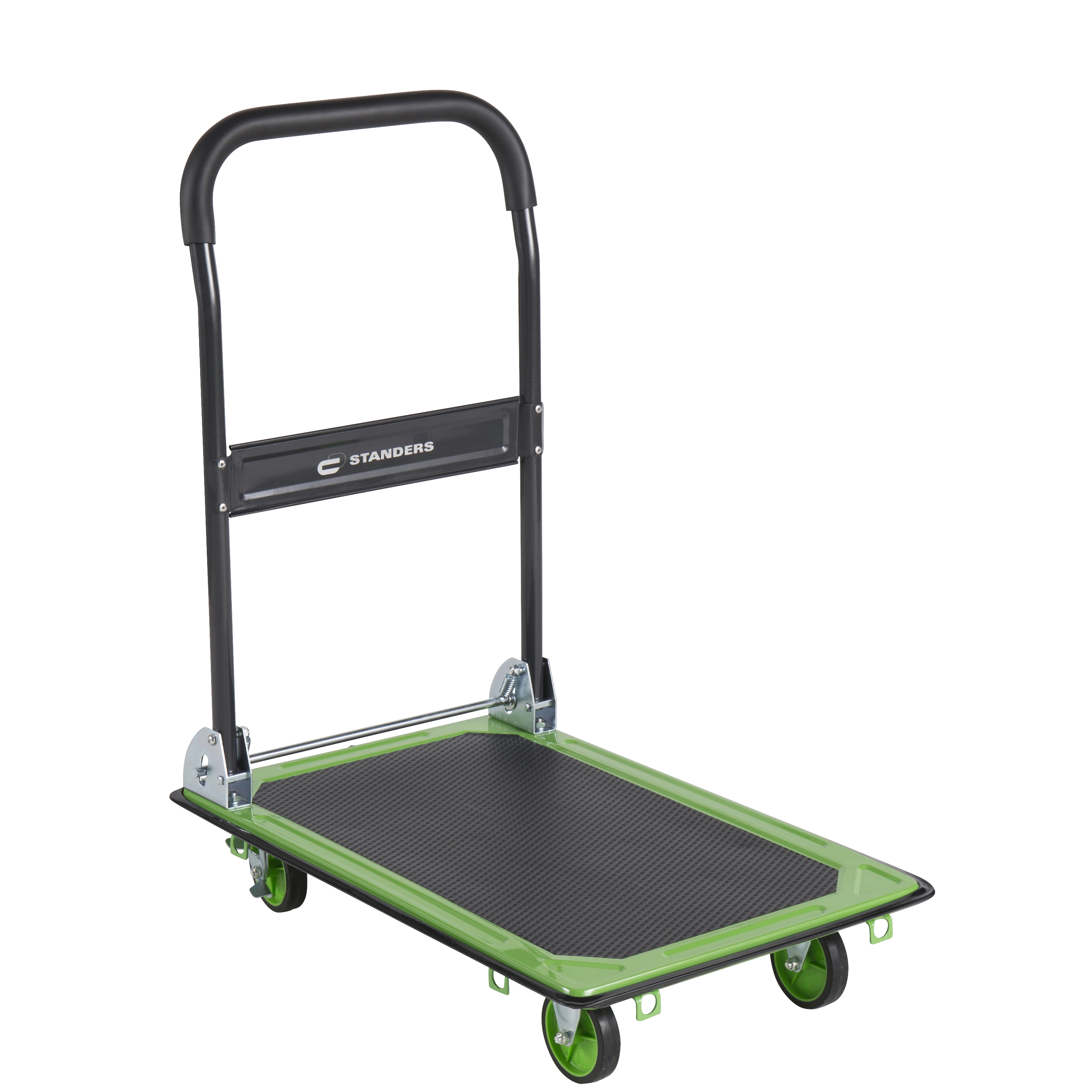 Ce chariot plate-forme pliable est idéal pour déplacer des cartons, des matériaux et des marchandises sur des sols durs, tels que des chaussées, zones de stationnement et allées. Avec une charge maximale à 150 kg, vous pouvez déplacer facilement de nombreux objets comme des appareils électroménagers, des cartons, des plantes. Grâce à la mousse de protection sur la poignée, la prise en main est ferme est confortable. Le guidon est pliable. En appuyant avec votre pied sur la barre située au bas de la poignée, vous pouvez ouvrir rapidement le guidon. Le chariot est alors prêt à être utilisé en quelques secondes. La surface de la plate-forme est recouverte d'un caoutchouc anti-dérapant ce qui permet à la charge de ne pas bouger pendant le transport. La plate-forme est conçue avec 4 trous pour accrocher des crochets de sandow ou de sangle et fixer ainsi votre charge sur la plate-forme. Ce chariot est recommandé pour une utilisation régulière. Nécessite une clé diamètre 14 pour le montage des roues.