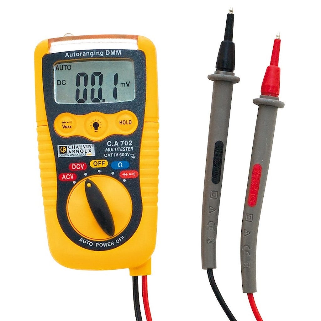 Multimètre numérique à détection de tension sans contact C.A702 de la marque Chauvin-Arnoux Tensions AC et DC : 200 mV à 600V Résistance : 200 Ω à 20 MΩ Tests de continuité ( buzzer ) et de diodes Sécurité : IEC 61010 - 600V CAT IV / 1000V CAT III Grâce à sa taille réduite et à ses pointes de touche solidaires, vous emporterez le CA 702 partout avec vous.La sécurité dans toutes les situations pour un outil de diagnostic toujours disponible. Découvrez notre boutique électricité !