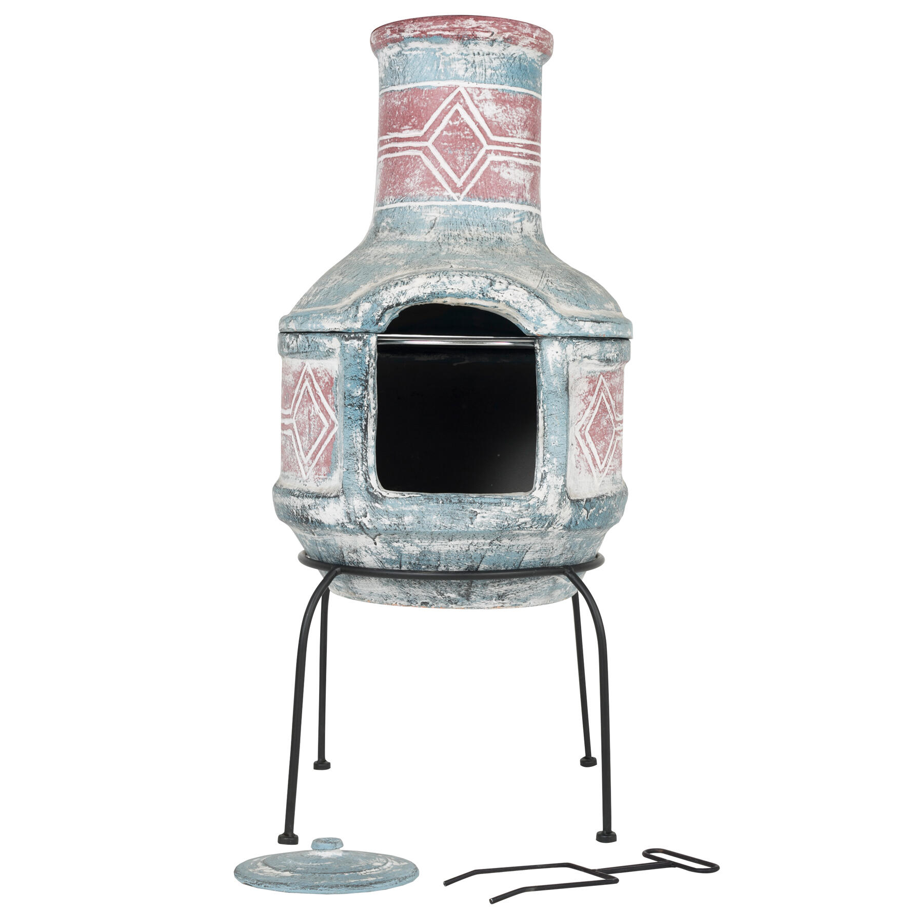 Cheminee type mexicaine. Livré avec une grille de cuisson. Fonctionne au bois. Chauffage d'extérieur naturelle. Livré avec un support en acier solide. Fini à la main de couleurs bleu et rouge avec décor géométrique. Comprend une grille de cuisson chromée, un tyson et un couvercle de protection contre la pluie. Conception en deux pièces pour enlever le dessus lors de la cuisson