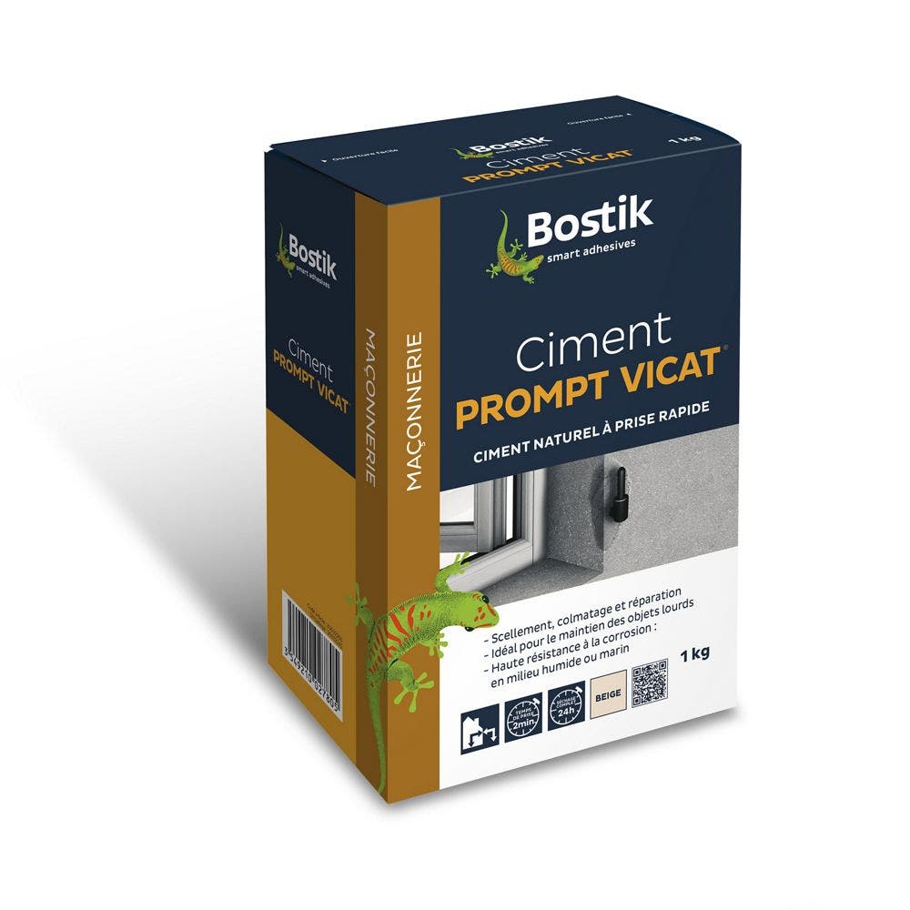 Pour scellement, calages, arêtes d'enduit, tableau de baies, montage de cloisons (parpaings, briques, béton cellulaire) solins, rebouchage de fissures, réparation ponctuelle de sols en béton. Travaux en milieu humide ou marin, réparations (bassins, regards, cuves), aveuglement de voie d'eau, jointoiement de tuyaux. Moulages décoratifs, moulures, pièces préfabriqués.. Le support doit être propre, exempt de graisse et de zones non adhérentes. Pâte pure : 3 volumes de ciment prompt et 1 volume d'eau. Mortier : 1 kg de ciment prompt + 2 l de sable + 0,5 l d'eau. 5 kg de ciment prompt + 10 l de sable + 2,5 l d'eau. 10 kg de ciment prompt + 20 l de sable + 5 l d'eau. Dans une auge propre, mélanger soigneusement le ciment, le sable et les gravillons avant d'ajouter progressivement l'eau selon les quantités indiquées. Malaxer manuellement à la truelle ou à l'aide d'un malaxeur électrique jusqu'à obtention d'une pâte homogène et sans grumeaux. Appliquer immédiatement. Temps d'utilisation du mélange : Pâte pure : 2 minutes. Mortier : 4 à 10 minutes. Séchage complet : 24 h environ. Performances mécaniques optimales : après 28 jours. Ne pas rebattre sous peine de casser la prise. Mise en charge des objets lourds : attendre 24 heures. Ce produit est compatible avec tous les colorants et adjuvants de la gamme Bostik. Ne pas utiliser ce produit sur un support à base de plâtre. Températures d'application comprises entre +5°C à +30°C. Ne pas exécuter de travaux sous la pluie ou en plein soleil. Mettre des gants et lunettes pour l'utilisation.