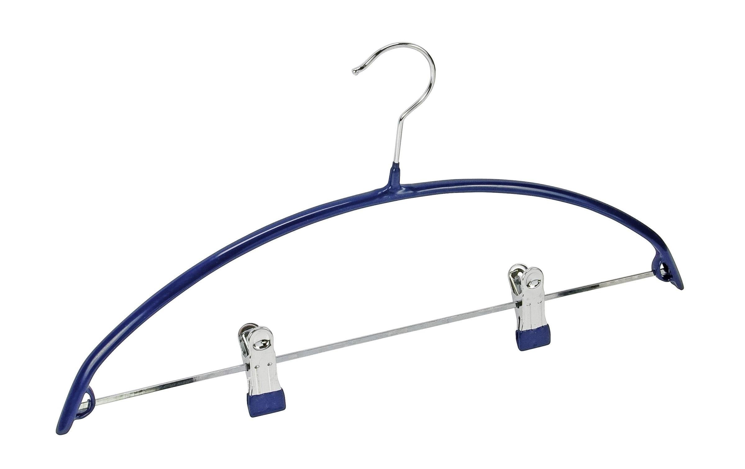 Le cintre optimal pour tous les vêtements : le cintre universel de type Compact est particulièrement approprié pour le rangement des vestes et des costumes ainsi que des pantalons, des jupes, des chemises, des chemisiers et des pull-overs. Le cintre compact pratique en métal comporte une barrette métallique avec deux clips de fixation et il offre une très bonne fixation. Le cintre combiné est enrobé de plastique bleu foncé antidérapant. Le crochet rotatif facilite la suspension dans l'armoire-penderie.