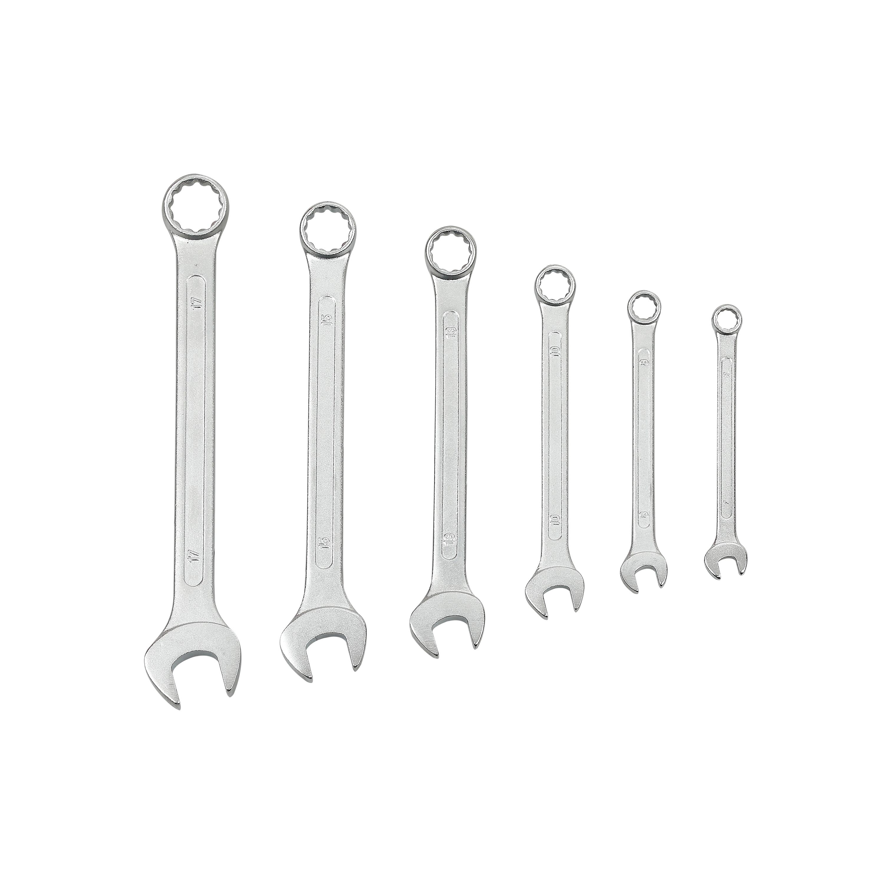 Jeu de 6 clés mixtes à 2 embouts, fixes et à oeil, en acier au carbone. Ils ont une taille de 7 mm, 8 mm, 10 mm, 13 mm, 15 mm et 17 mm.