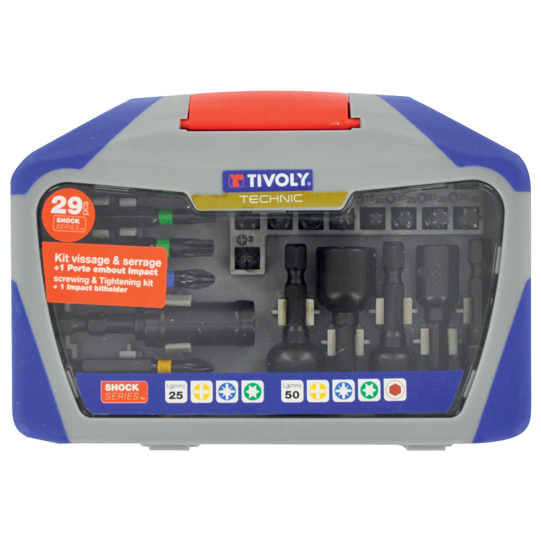 5 embouts PH 1- 2- 2- 2- 3 L25mm + 4 embouts PZ 1- 2- 2- 3 L25mm + 8 embouts TX10- 20- 20- 25- 25- 30- 30- 40 L25mm + 2 embouts PH2- 2 L50mm + 1 embout PZ 2 L50mm + 3 embouts TX 20- 25- 30 L50mm + 5 noix de serrage 6- 8- 10- 12- 13 + 1 porte-embout impact à puissant aimant circulaire