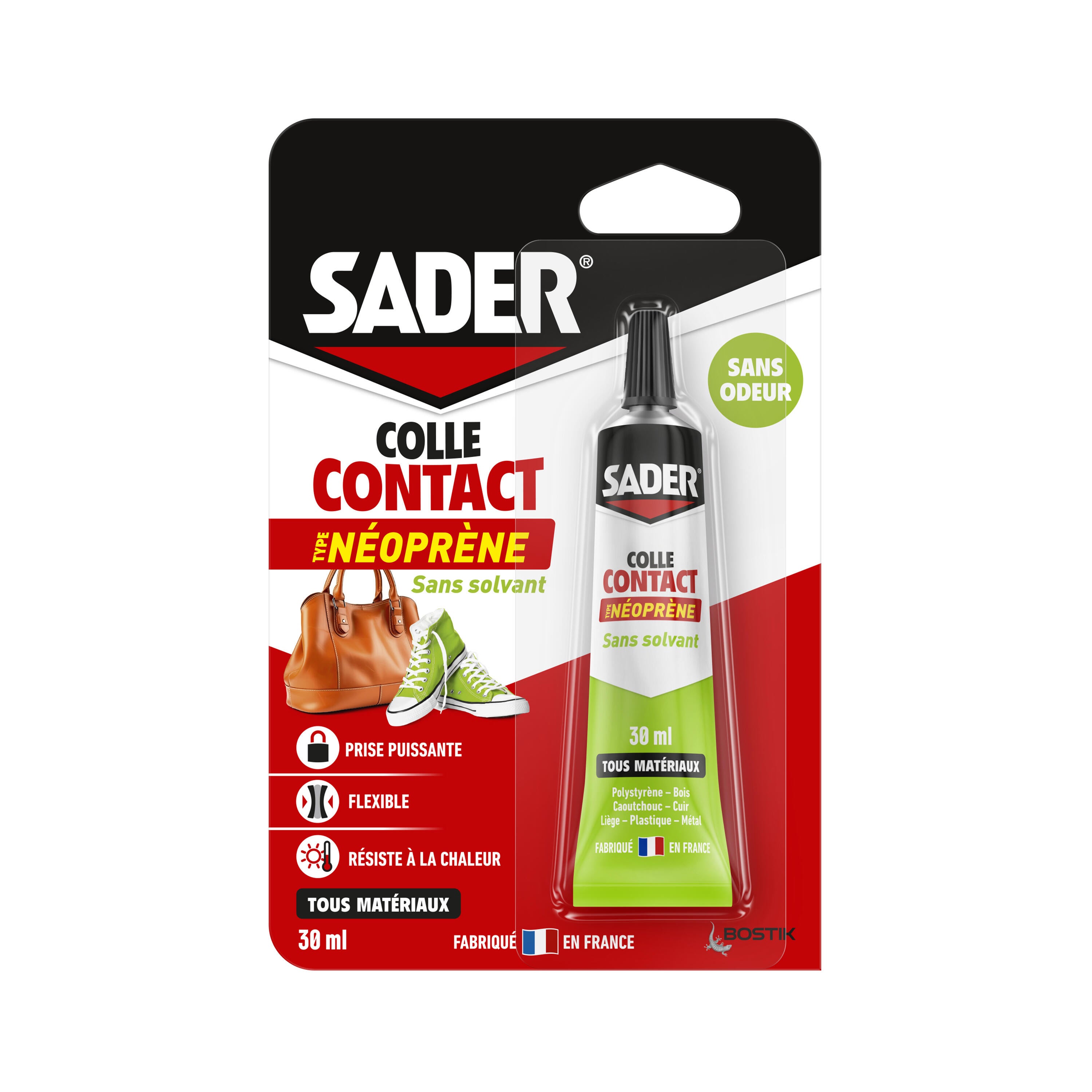 La colle contact type néoprène sans solvant SADER Tube 30ml est idéale pour les assemblages et plaçages en intérieur. Applicable sur de nombreux matériaux, elle permet de fixer du bois et stratifiés (baguettes, plans de travail, chants de table...), du métal (habillage de tôles, doublages de portes...), du caoutchouc (semelles, dalles de sol, nez de marche...), du liège (dalles, revêtements muraux...), du cuir et similicuir (bagages, vêtements, chaussures...), du polystyrène expansé ou extrudé (plaques, rosaces, moulures, dalles de plafond..) ou encore du plastique rigide en surfaces planes (revêtement de sols, gaines, plinthes électriques...) hors PE, PP. Sa formule lui confère une prise immédiate et définitive. Elle résiste à l'humidité comme à la chaleur (jusqu'à 110°C) et dispose d'une haute résistance à l'arrachement. Après séchage, la colle devient transparente. Utilisation intérieure - Sans solvant (Norme EN 923) - Sans odeur - Très faibles émissions de COV (A+) - Résistance maximale après 24 à 48 heures - Fabriquée en France.