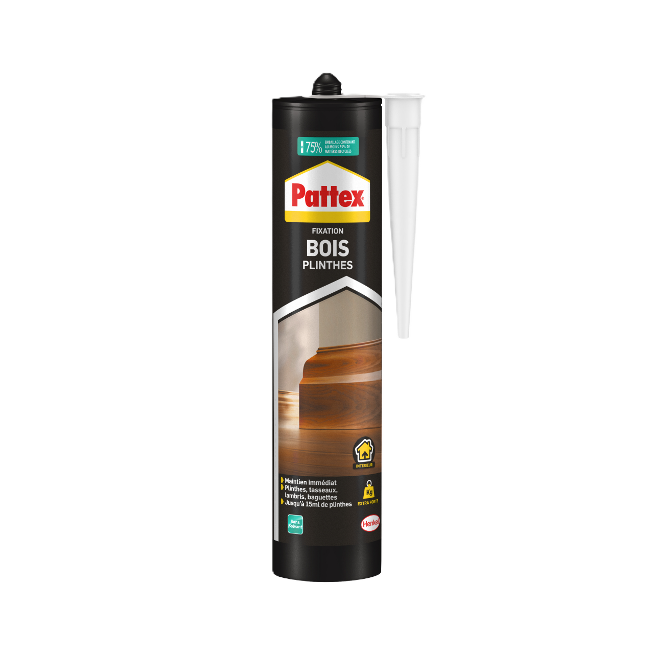 Pattex Fixation Bois est une colle extra-forte pour tous travaux d’intérieur sur bois ou polystyrène. Elle est iéale pour la fixation de plinthes, lambris, baguettes profilées, tasseaux et pour la réalisation d’ouvrages décoratifs comme la pose de moulures, rosaces, dalles ou briquettes. Il faut qu’un des 2 matériaux à coller soit poreux. La colle Pattex permet un maintien immédiat à condition de ne pas solliciter les supports pendant 48H. Grâce à elle, il est possible de fixer jusqu’à 100 kg/cm2. 1 cartouche = 15 mètres environ, peut être peint.