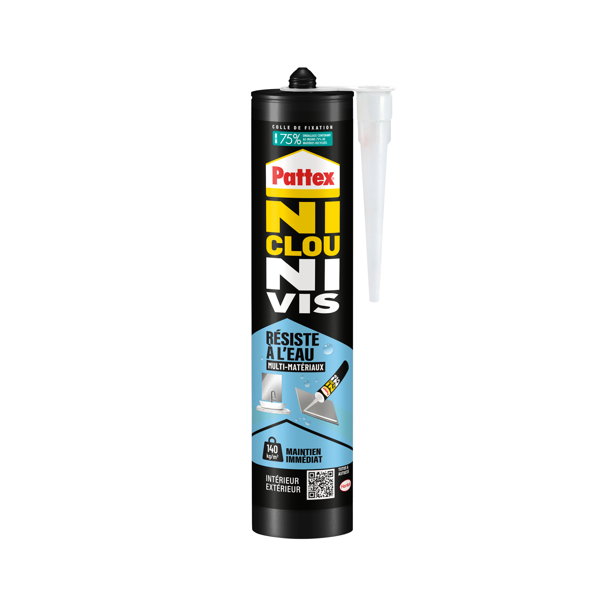 Pattex Ni Clou Ni Vis Tous Matériaux Intérieur et Extérieur est une colle polymère hybride Technologie Flextec sans solvant et sans odeur. Sa technologie nouvelle génération vous offre un maintien immédiat élevé et reste positionnable pendant 10 minutes. Elle permet de coller ou recoller moulures, prises et câbles, dalles, boîte aux lettres, éléments décoratifs, miroirs, carrelages, lambris PVC, etc… Cette colle est efficace sur tous matériaux (*sauf PE, PP, PTFE, verre acrylique, cuivre, laiton et PVC souple) et s'utilise aussi bien en intérieur comme en extérieur. Elle ne se retracte pas et peut sans peindre en gardant toute sa flexibilité. Résistante aux vibrations, à la chaleur, à l’eau et à l’humidité, elle peut être utilisée sur des supports temporairement humides. Sa formule est sans solvant et sans isocyanate, ce qui la rend non irritante pour la peau. 1 cartouche = 15m de cordon environ