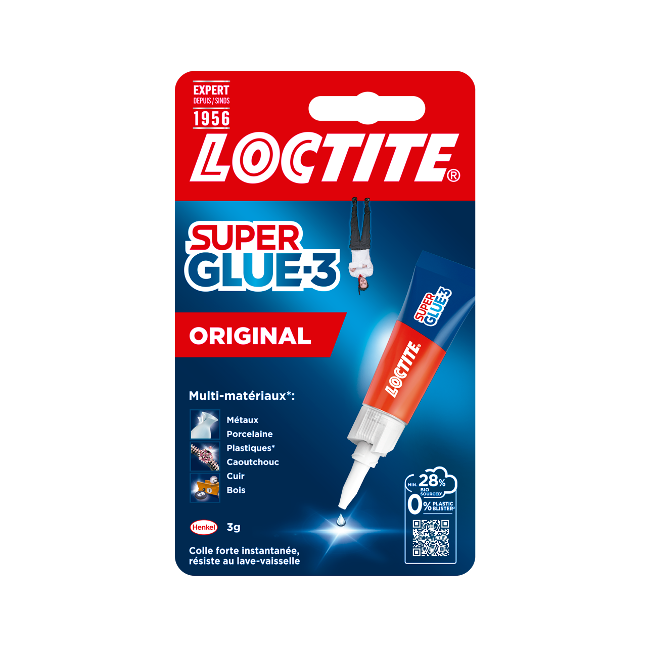 La colle loctite Super Glue-3 Original colle rapidement et durablement tous les matériaux. C'est une colle cyanoacrylate, elle est transparente au séchage et offre une résistance instantanée, pour des réparations qui durent et qui ne se voient pas. Pratique et facile à utiliser, cette colle fonctionne sur une grande variété de matériaux (bois, caoutchouc, porcelaine, cuir, plastique, ...). La super glue est non seulement résistante à l'eau et au lave-vaisselle, mais aussi aux chocs et aux températures fortes. Idéale pour des applications variées. Elle dispose d'un bouchon anti-séchage afin que vous puissiez la réutiliser lors de vos divers projets de réparations ou collages.