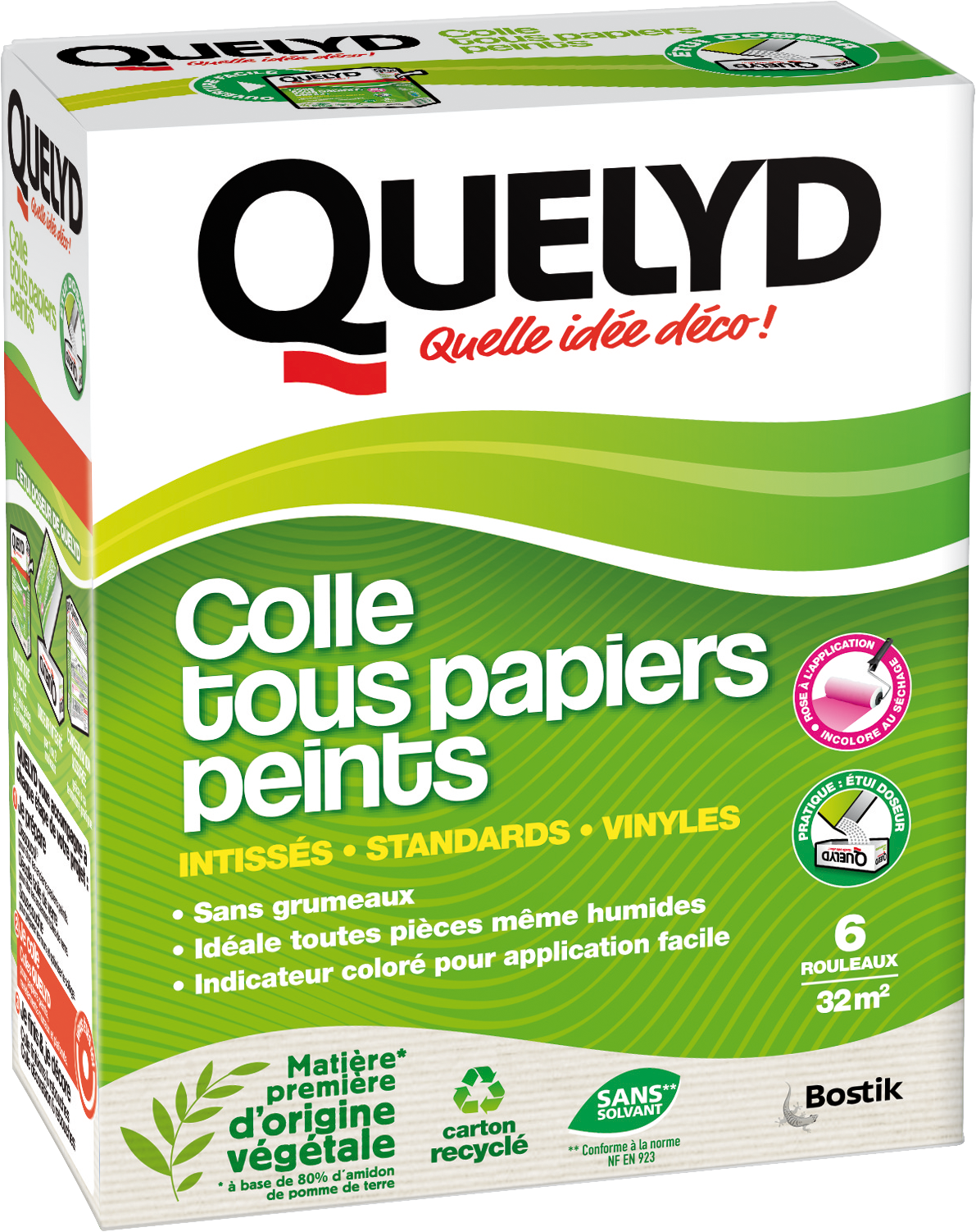 La colle Poudre tous papiers peints QUELYD avec indicateur coloré vous permet de coller de nombreux types de papiers peints : standards, intissés, intissés à peindre, vinyles, vinyles à peindre, vinyles expansés sur intissés, courants, légers... Sa formule permet une préparation rapide sans grumeaux et un dosage facile grâce à son étui doseur. L'application est facile grâce à l'indicateur coloré qui permet de savoir exactement où la colle a été déposée pour n'oublier aucun recoin. La colle devient transparente au séchage. Ce format 300g vous permettra de coller 6 rouleaux soit 32 m². Pack en carton recyclé - Matière première d'origine végétale.