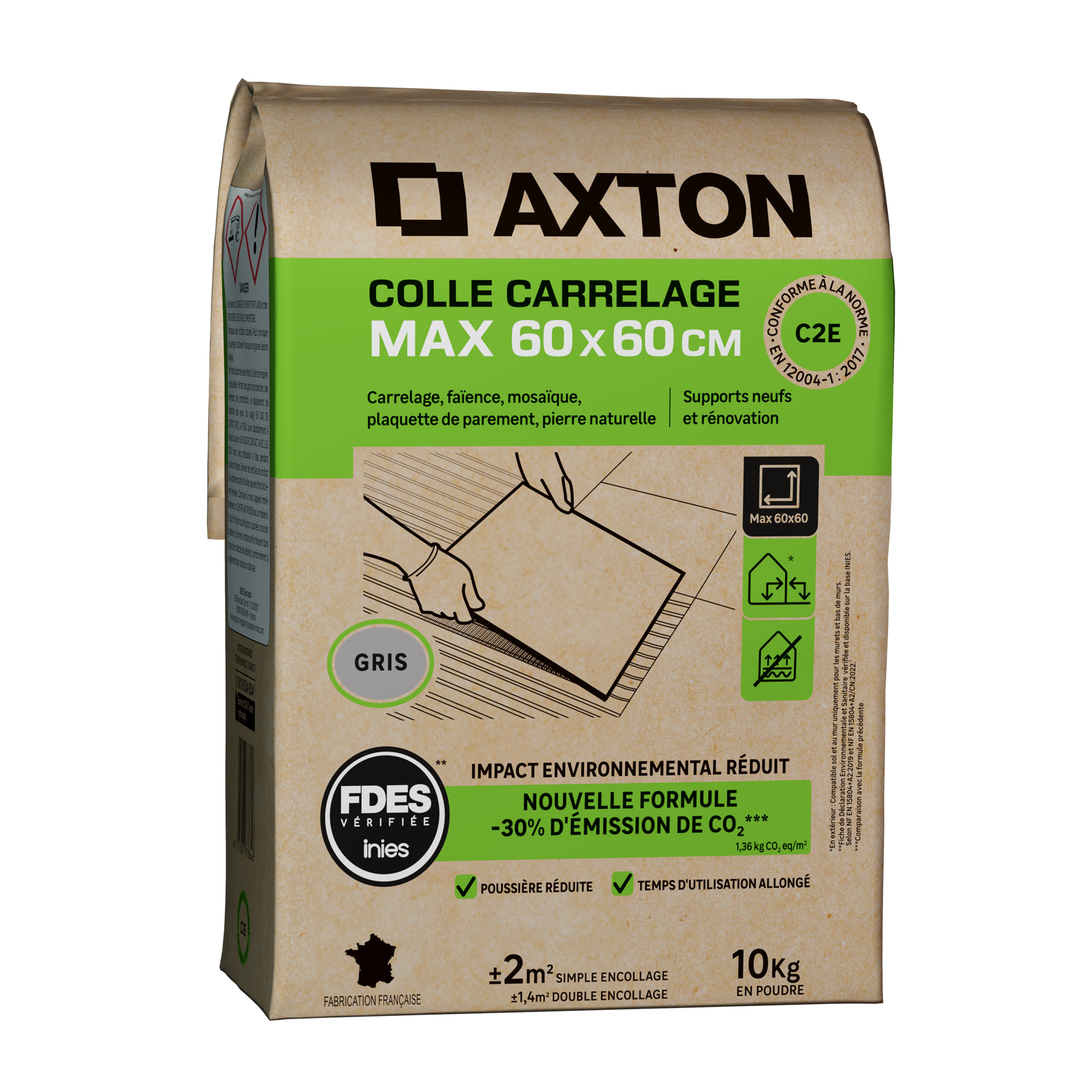 Colle carrelage grise en poudre AXTON pour la pose de carreaux au sol et au mur, de dimensions 60 x 60 cm maximum. Idéale pour la pose de carrelage, faïence, mosaïque, plaquette de parement et pierre naturelle, en intérieur et en extérieur.Non compatible sol chauffant. Dans le cas de la pose de pierre naturelle, toujours effectuer un test de tachabilité sur une zone non visible.Sous forme de poudre, sa préparation est facile. Dans un seau, mélanger le produit avec de l'eau (quantité précise indiquée sur l'emballage) avec un malaxeur jusqu'à l'obtention d'une pâte homogène.Produit à impact environnemental réduit : avec sa nouvelle formule, la colle Axton réduit son impact environnemental de 29% par rapport à la formule précédente (1,37 kg CO₂ eq/m² ) et possède une FDES (Fiche de déclaration environnementale et sanitaire) vérifiée par l'INIES.