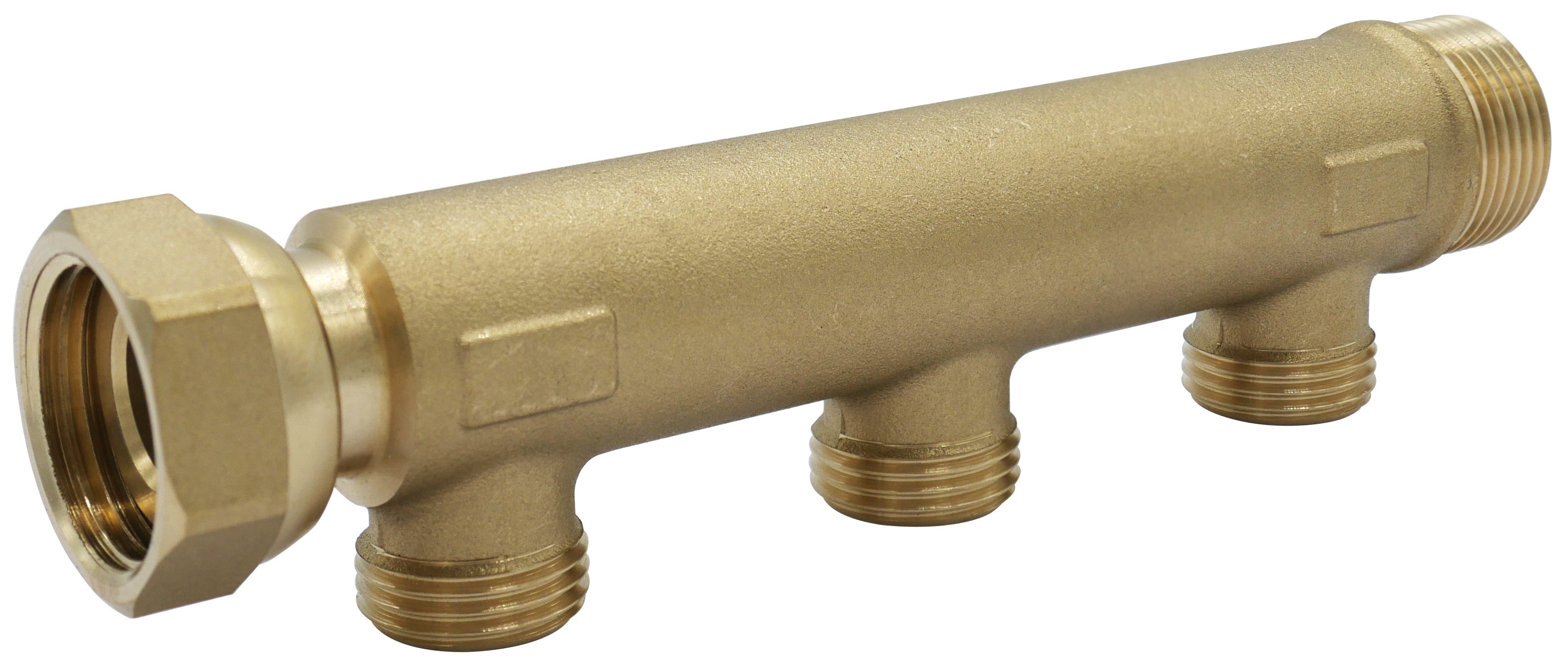 Collecteur écrou libre avec entrée et sortie 20x27, incluant 3 départs mâles 15x21, pour distribuer efficacement l'eau dans un logement. Le jumelage de collecteurs est facilité grâce à l'écrou libre qui permet une fixation rapide et un positionnement précis.