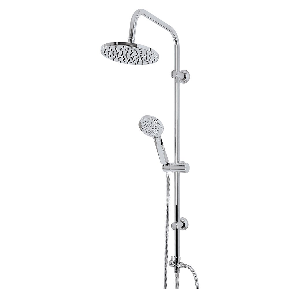 La colonne de douche ronde en acier chromé est complète avec pomme de douche (H 105 cm - ø 20 cm), douchette à main à trois fonctions, flexible de douchette à main de 150 cm en acier inoxydable avec raccords en laiton et inverseur en laiton chromé, un matériau extrêmement résistant à l'eau courante et à l'entartrage. La douche de tête est en ABS chromé avec buses autonettoyantes, et la douchette à main est enmonofonction ABS chromé, également avec buses autonettoyantes.