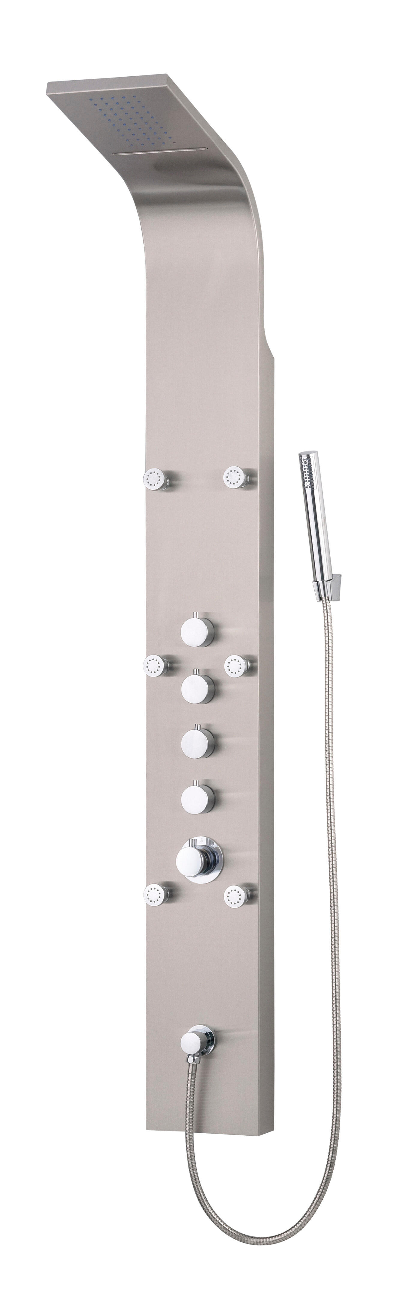 Colonne de douche d'hydromassage Orys avec 6 jets, robinet thermostatique et finition chromée adaptée aux douches. L'arroseur de forme rectangulaire possède 1 jet effet pluie et dispose de buses anticalcaire pour faciliter le nettoyage. Son panneau d'hydromassage et son jet effet cascade sont idéaux pour offrir à votre dos confort et commodité. Il bénéficie d'une garantie de 5 ans. Dimensions : 20 x 166,5 x 46 cm (largeur x hauteur x profondeur). Dimensions du pulvérisateur : 16 x 8 cm (largeur x hauteur).